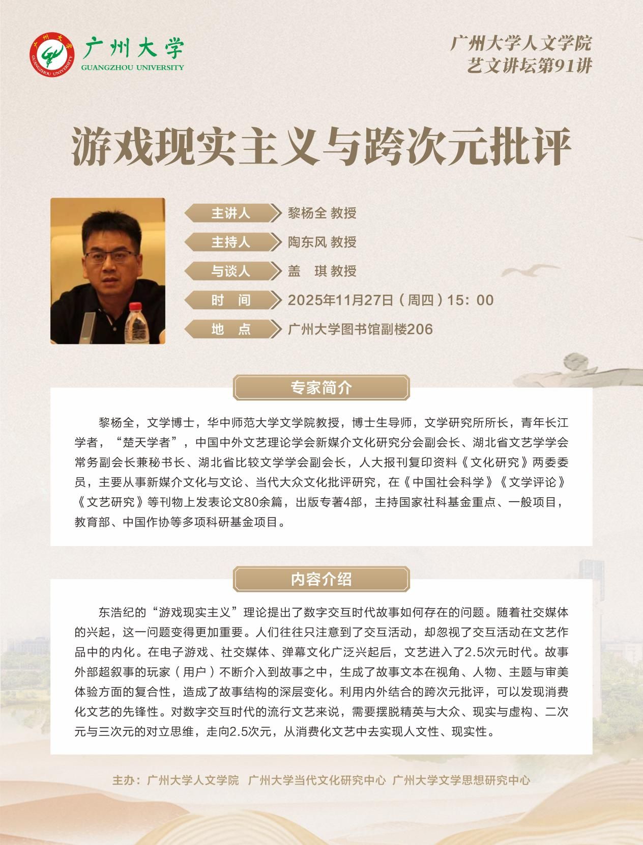 讲座预告丨黎杨全:游戏现实主义与跨次元批评
