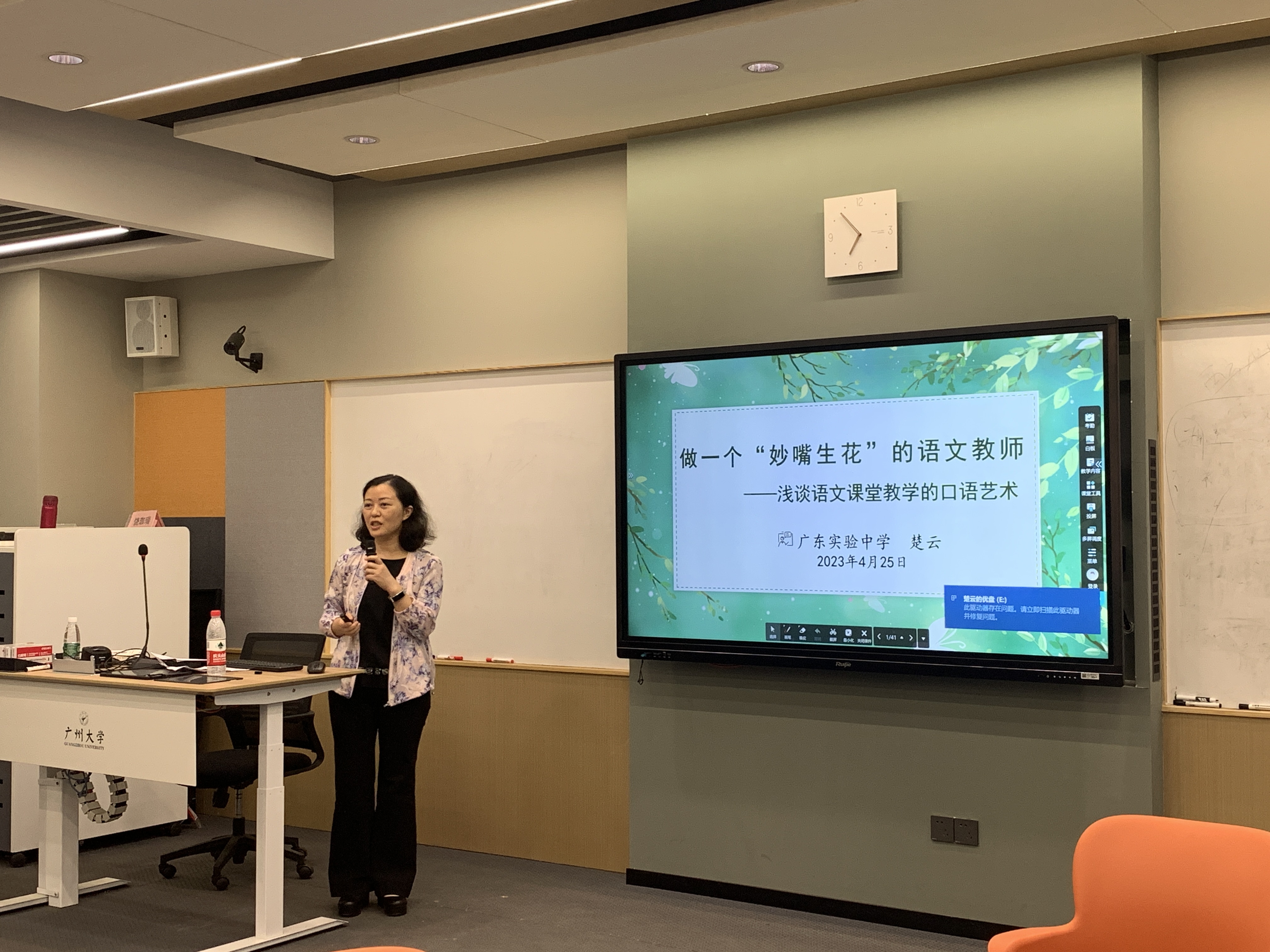 2023年4月25日,语文教学工作坊(第六期)邀请了广东实验中学正高级教师、特级教师楚云老师,楚云老师以“做一个‘妙嘴生花’的语文教师”为主题展开授课,带同学们体验了一次沉浸式课堂。本次课程分为“语文教学口语的理论讲解”和“语文教学口语的设计实践”两个环节。