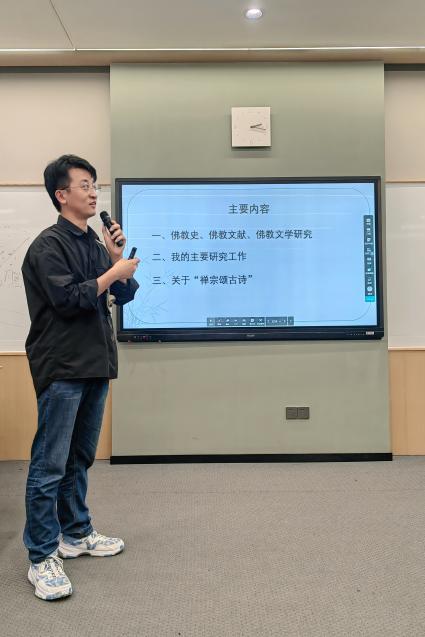 博士后张倡玮对主讲人侯本塔、与谈人尹倩和谭樊马克进行介绍。随后,主讲人侯本塔从“佛教史、佛教文献、佛教文学研究”“我的主要研究工作”和“禅宗颂古诗专题研究”三个方面展开陈述。