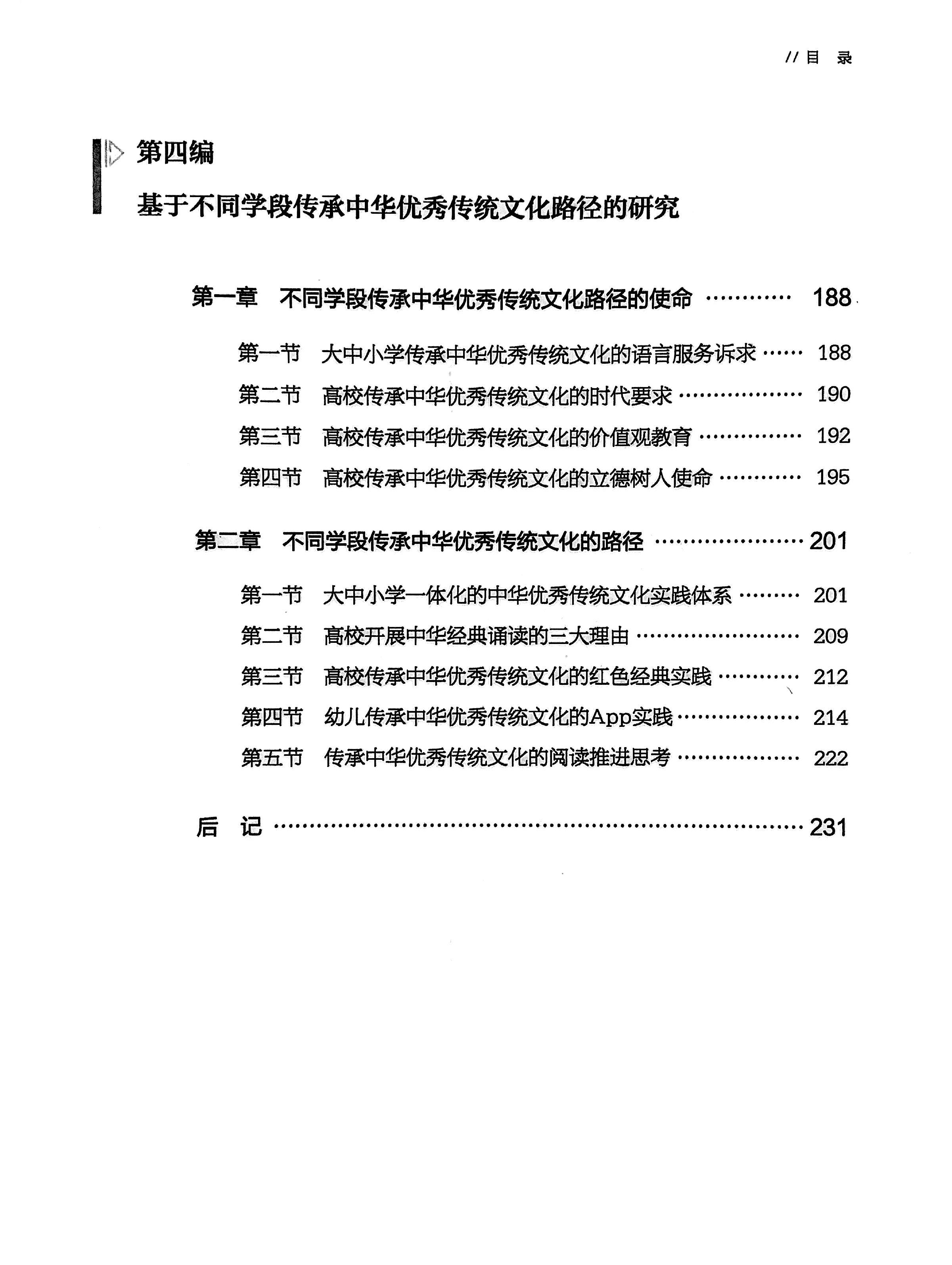 《研究》四编的大致内容与主要作者情况。第一编是“不同区域中华优秀传统文化教材的系统梳理与比较研究”,两章共六节,主要进行中华优秀传统文化教材建设的现状描述与反思,同时探讨中华优秀传统文化的课程化的相关思路与个案实践问题,主要作者是温小军、祝安顺。第二编是“中华经典诵写讲案例库建设及其相关研究”,三章共十节,主要是对本课题承担的中华经典诵写讲案例库建设进行介绍并对相关的实践活动进行总结,第三章专门对吟诵教学进行了不同角度的观察和分析,以期对诵写讲活动开展能给予更多的建设性的意见和建议。本编的主要作者是禤健聪、林晖、林丹宜、邓慧淳、黄恺、赵建璇、张俊杰、周志方等。第三编是“不同类型层次经典诵读与经典阅读的实践验证”,三章共七节,其中一章是贯通大中小学分析经典诵读与经典阅读的实践把握,一章是以高校为重点研究其经典诵读与经典阅读的探索实践,一章以中小学为重点报告并分析其经典诵读与经典读的实践。本编的主要作者是纪德君、龙其林。第四编是“基于不同学段传承中华优秀传统文化路径的研究”,两章共九节,分别从“使命”和“路径”两个维度用绕中华优秀传统文化进行了较为充分的分析讨论。本编的主要作者是屈哨兵、于琼、哈迎飞、王毅力等。上述分编列出的相关的作者没有重复,实际上本课题成员好几个是“跨编”研究进行作业的,其中贡献尤为突出的是纪德君、禤健聪、温小军、祝安顺、龙其林几位。学校语委办和丹丹博士在课题申报和课题阶段推进以及课题结项过程中做了大量工作,这些工作不能在成果标注上反映出来,但实际上是极其重要的,马喆、刘惠琼和王国栋、廖宏建、郭杰几位同志在课题研究过程中也做了大量工作。所有这些,都显示出一种可贵的团队协作精神。人民教育出版社顾之川编审、教育部语信司李强同志、广东省教育厅袁本新同志、广州市教育局刘平伦同志在课题启动执行过程中给予了很多指导支持,在此一并致谢。