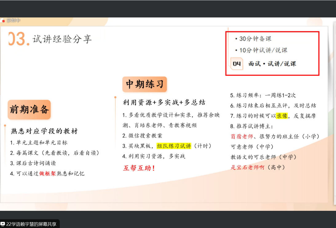 邓湘林同学从招聘流程、考情分析和备考经验三方面进行分享,介绍了考编流程和注意事项、不同地区笔试和面试的考情以及针对性的备考建议。欧阳玉琰同学主要分享了如何解读招聘公告,应该重点关注哪些内容以及考前如何准备,鼓励同学们确定报考的学段并多加练习。朱欣妮同学从自身考编历程出发,分析了佛山和中山等地区的考情,建议同学们在暑假多熟悉教材,在实习期间多抽时间备考,同时争取备考和写论文同步进行。林浩同学主要分享了如何制作简历册,笔试应该如何学习以及面试当中试讲和结构化的独特备考思路等内容。