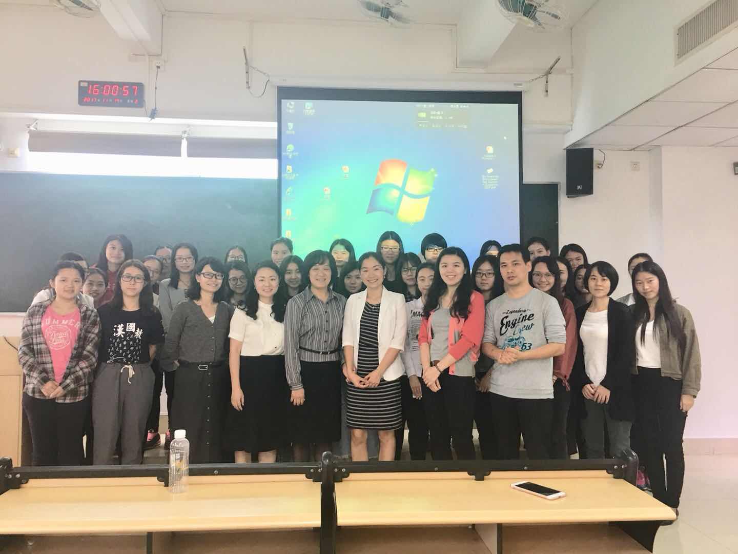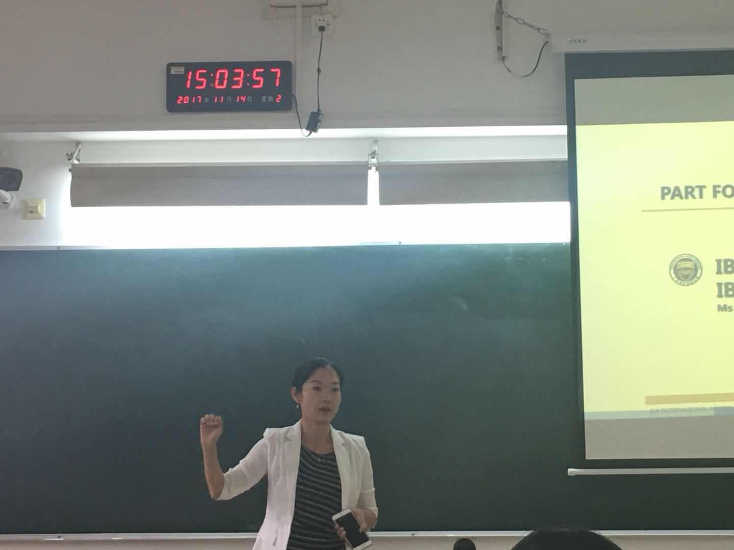 汉语国际教育实践基地负责人和课程主管一行三人来校进行讲座,该讲座在文清楼306室举行。宣讲人分别是广州艾莎国际学校副校长林钰,中文教学校长唐丽红,以及课程主管Patricia Pope。本次讲座由该实践基地负责人张晓苏老师主持,语言系马喆老师,张迎宝老师出席,汉语国际教育研究生及本部本科生参加。