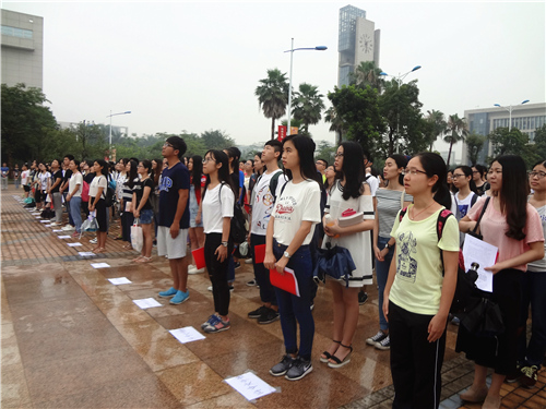 全场人员注视着国旗,齐唱国歌,“起来,不愿做奴隶的人们......”有力的歌声在图书馆广场萦绕不绝。当《义勇军进行曲》最后一个音符落下,五星红旗已在空中飘扬。