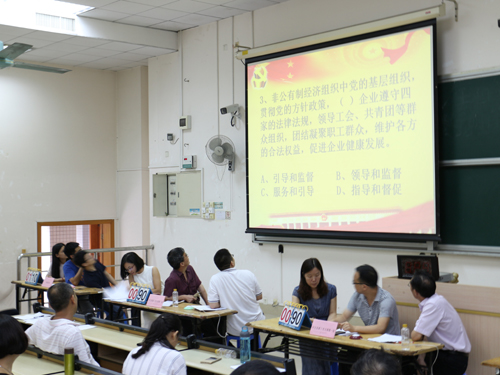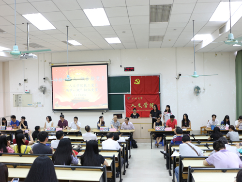 之后,院团委书记张立主持介绍了此次竞赛的规则和加分制度。同时,参加“两学一做”知识竞赛的党员们被分成了五组,分别为行政党支部、中文系教工党文学支部、中文系教工党语言支部、历史系党支部和秘书系党支部,每组党员有三人。至此,比赛正式开始了。