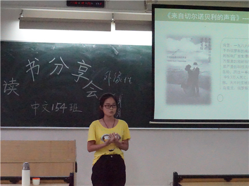随后,又到了同学分享书籍环节。上台的三位同学分别推荐了《我不知道该说什么,关于死亡还是爱情:来自切尔诺贝利的声音》、《现代文明的批判》和《禅与摩托车维修艺术》这三本书,并向大家介绍了书中的内容。本次中文154班领导联系班级活动顺利结束。