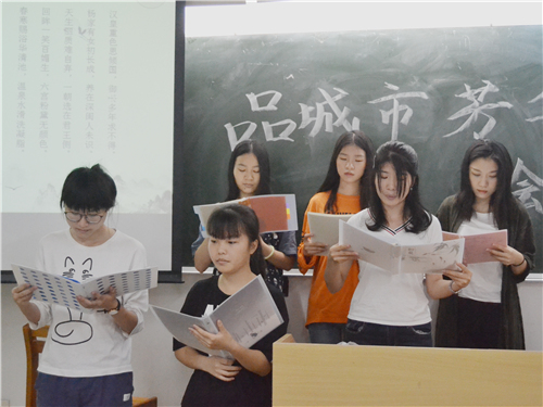 同学们此次研读的经典著作是《唐诗三百首》,首先 全班同学以宿舍为单位采用诵经典、唱经典等不同形式展示《山居秋暝》、《长恨歌》、《古从军行》等诗歌作品并分享了自己的理解,而后参与了计时背诗比赛。同学们用不同方言朗诵的《长恨歌》和以中英文朗诵的《古从军行》赢得了在场观众的热烈掌声与领导老师们的一致好评。
