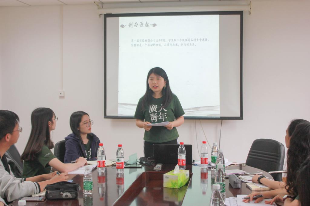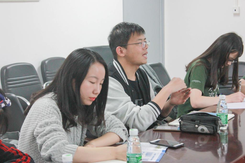 的考勤、评优评先、特色建设工作、科研工作、班级班风建设与“人心向学”工程实施工作六个部分,并在最后提出了有关“创新创业”与“职业规划”、班级班风建设与学生干部培养四个方面的问题。其中“创新创业”与“职业规划”方面,甘师姐表示南大文学院同样存在着文科生缺乏创新意识的普遍情况,并提出了我们或许应当充分利用本专业,结合时事与现实,多做一些有趣的课题,多尝试挑战挑战“挑战杯”。于师兄也为我们介绍了南大的创业指导中心,展示了南大的就业小组——导师——就业指导中心——企业的链条式就业指导体系。