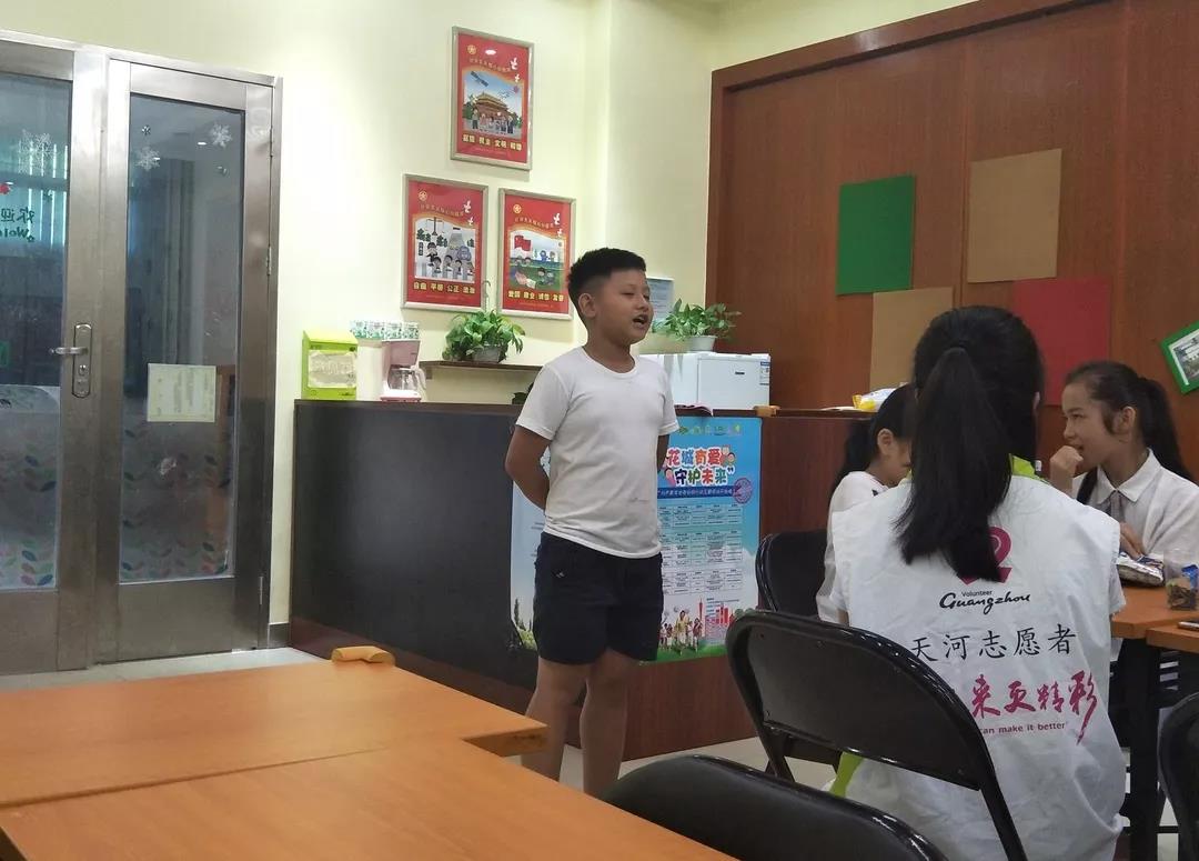 第二个环节是分享互动环节,由志愿者引导孩子们讲出自己的成长烦恼或成长经验,然后每个小组推荐一位成员在所有成员面前进行分享,社工根据成员的分享内容,选择积极正面的元素跟孩子们一起分享,号召孩子们努力学习。