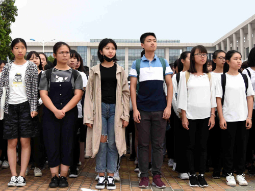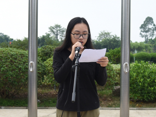 升旗后,2017−2018学年国家奖学金候选人黄嘉嘉同学在国旗下做以“时刻保持学习状态”为主题的演讲。