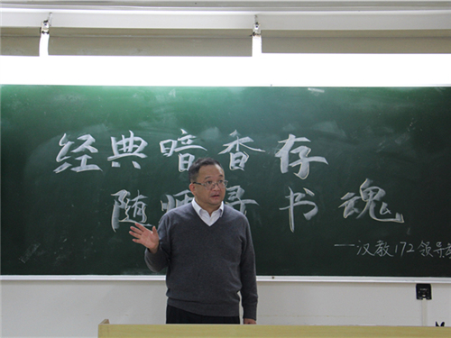 (本网讯)12月19日下午,汉教172班在文新203顺利开展以“经典暗香存,随师寻书魂”为主题的领导、教授联系班级暨经典百书导读活动。校党委书记屈哨兵同志、院党委书记王琼同志、院党委副书记刘军军同志等领导老师参与了本次活动。
