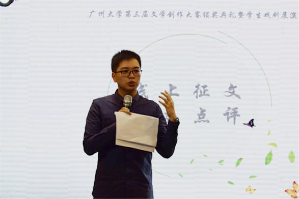 紧接着,彭贵昌老师针对线上征文情况作出总结。彭贵昌老师提出,文学创作大赛的影响力与认可度在逐年提高,其中,本次大赛现实题材作品占比较高,体现了同学们对社会与人生的思索,呈现出广大学子的家国情怀与人文关怀。
