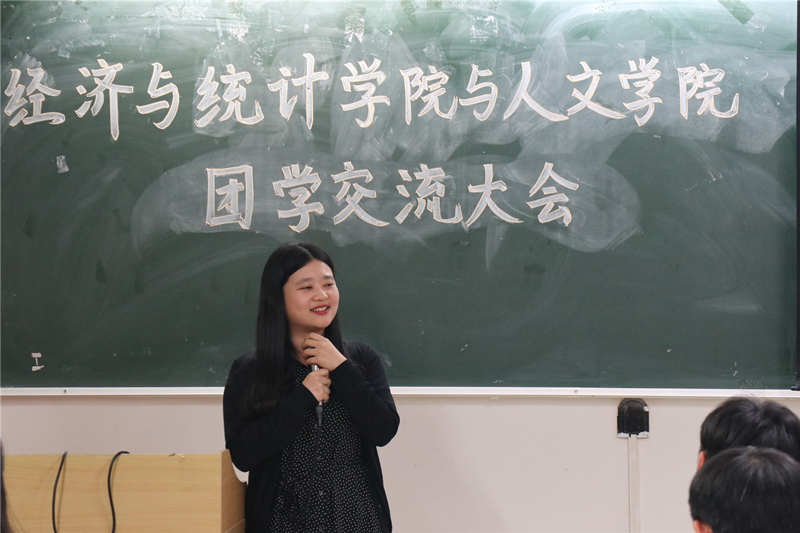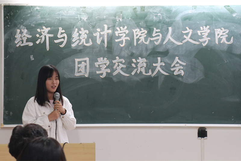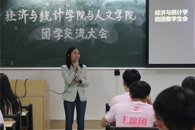 团委书记张立老师发言致辞。张立老师一是表扬了经统学院的学生工作,她根据经统团学近几年在红旗学生会以及红旗团委的表现赞扬经统团学工作扎实;二是她希望通过此次团学交流大会,两院的学生干部之后能够保持良好的友谊,相互学习、相互进步。