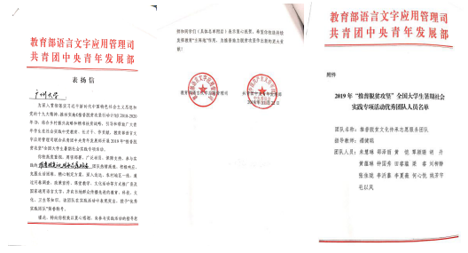 “推普脱贫文化传承”志愿服务团队在2019年暑期开展的“推普脱贫攻坚”全国大学生暑期社会实践专项活动中表现出色,获得“优秀实践团队”荣誉称号。教育部语言文字应用管理司、共青团中央青年发展部高度肯定了该团队在梅州市偏远山区助力脱贫攻坚志愿服务所作出的贡献,对成人电影