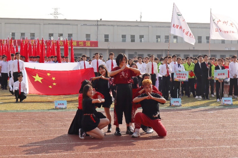 开幕式初,音乐响起,人文方阵昂首挺胸,迈着整齐的步伐向主席台走来,高喊“文思泉涌,潮儿弄江;看我人文,笑傲群芳”的口号,让在场的全体师生感受到了人文学子昂扬向上的精神风貌。