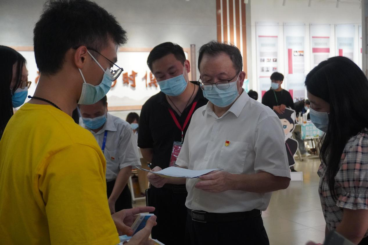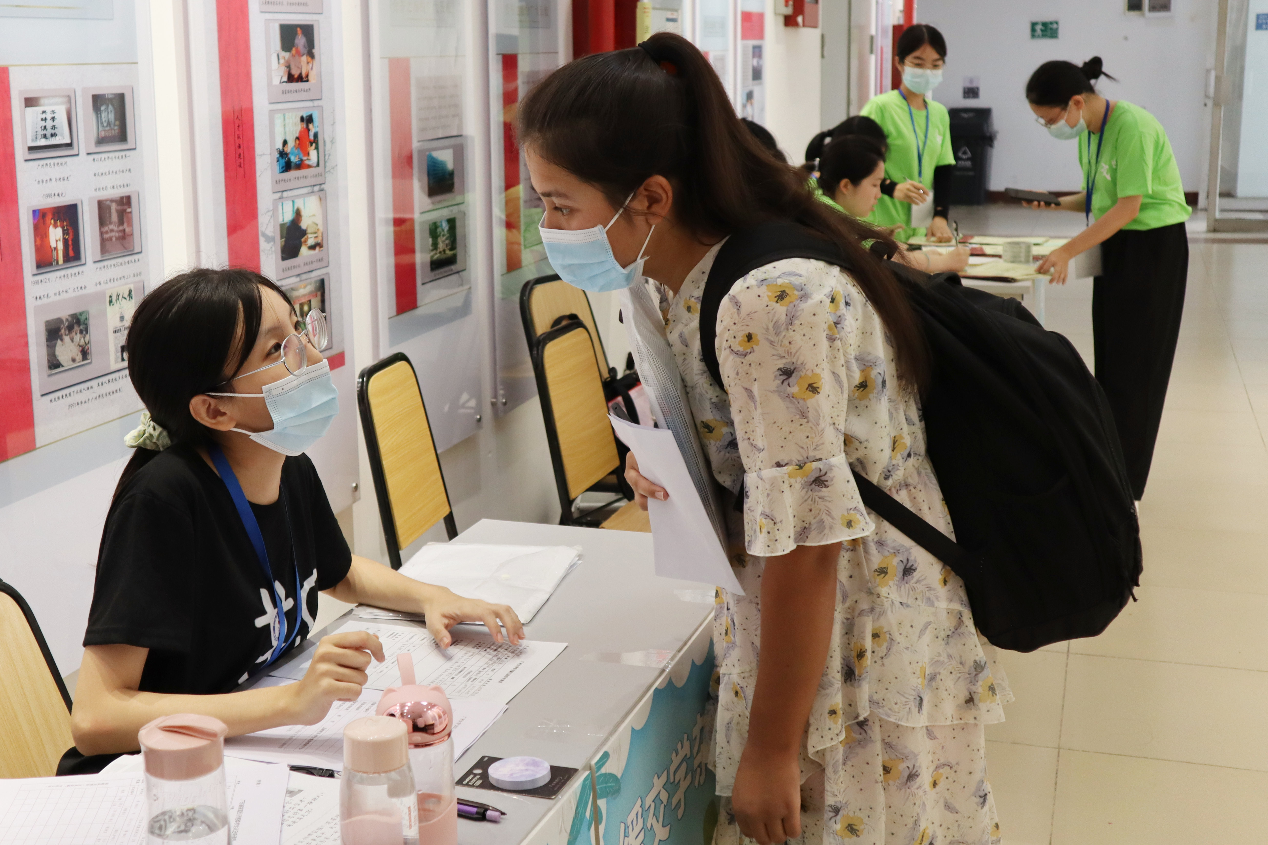 报到点,欢迎新生入校,了解关心新生安顿情况,提醒大家遵守学校防疫规定,做好个人防护。同时,他们鼓励同学们要做好合理规划,尽快调整学习状态,投入到大学的学习之中。