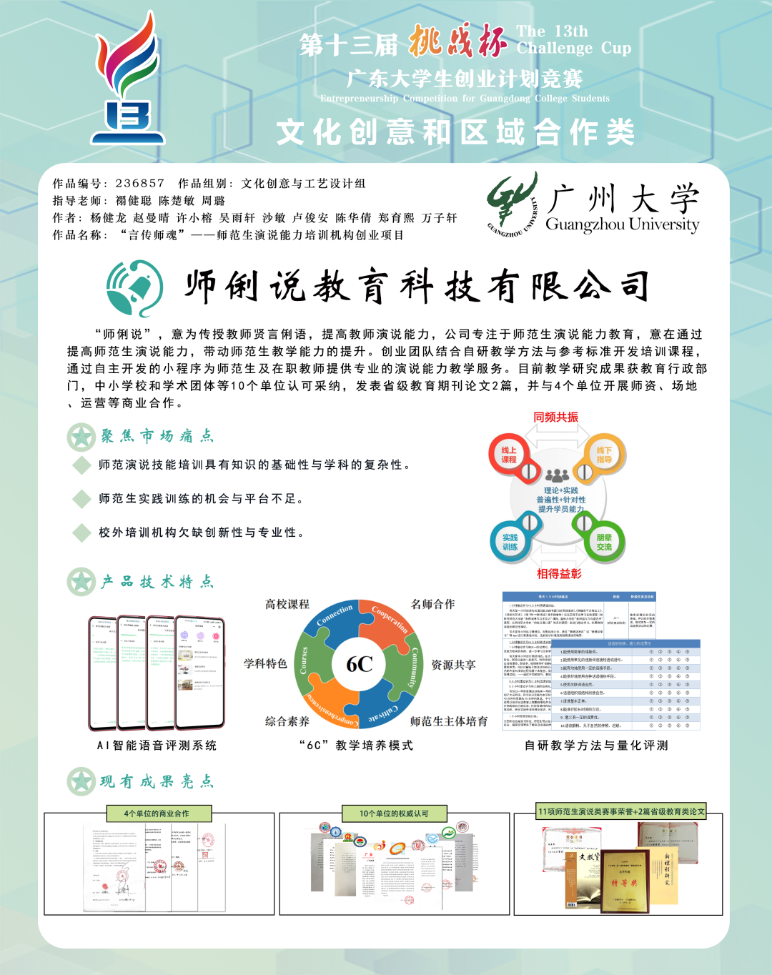 “言传师魂”创业项目在第十六届“挑战杯”广东大学生课外学术科技作品竞赛基础上进行创业实践,于2021年获校级立项,项目所设计的“师俐说教育科技有限公司”致力于提高师范生演说能力,增强教师职业教学技能训练,结合自主研发教学技术与师资团队,以培养师范生演说能力这一小切口带动师范生的教学能力提高,为志向从事教育行业的大学生以及入职教师提供发展机会,结项成果曾获成人电影