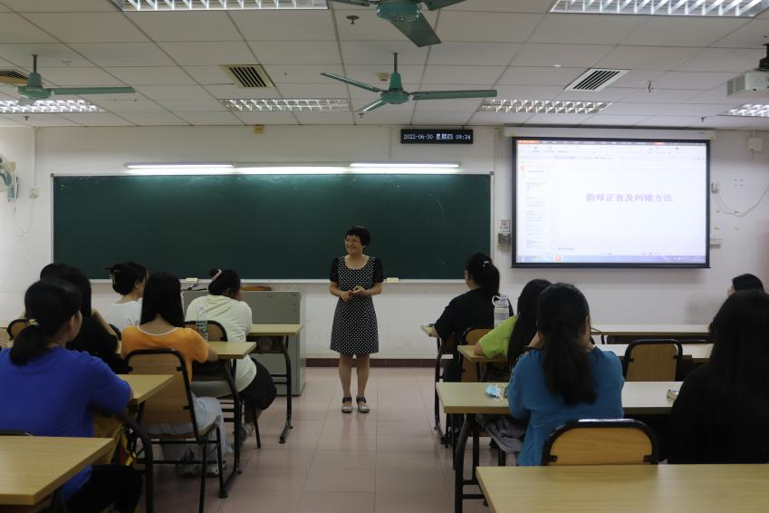退休教师冯春对普通话中的韵母进行训练,讲解了韵母的正音及纠错方法。冯老师着重对同学们的前鼻韵母和后鼻韵母进行了辨析训练,从单字、词语、句子等角度对同学们的韵母进行发音训练。