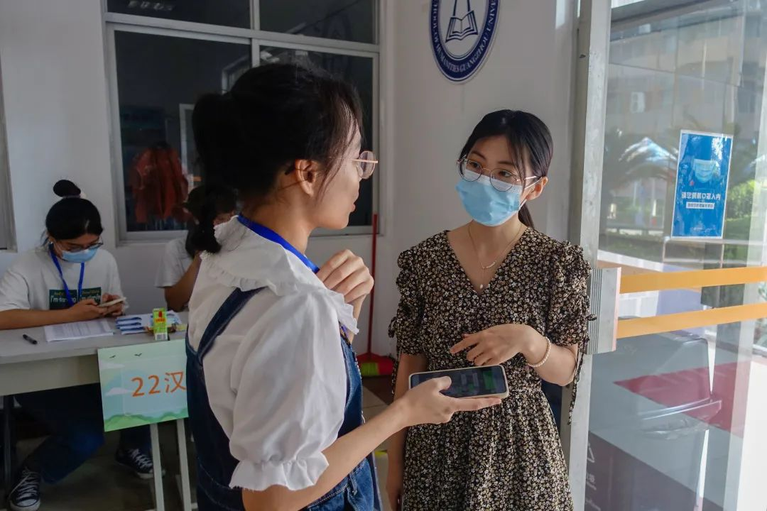 早上八点,报到点在暖阳晨风中迎来第一位新同学,志愿者们在谨慎做好防疫工作的同时,认真细致地给新同学核对报到信息、收发开学材料,整个报到流程有条不紊地进行。