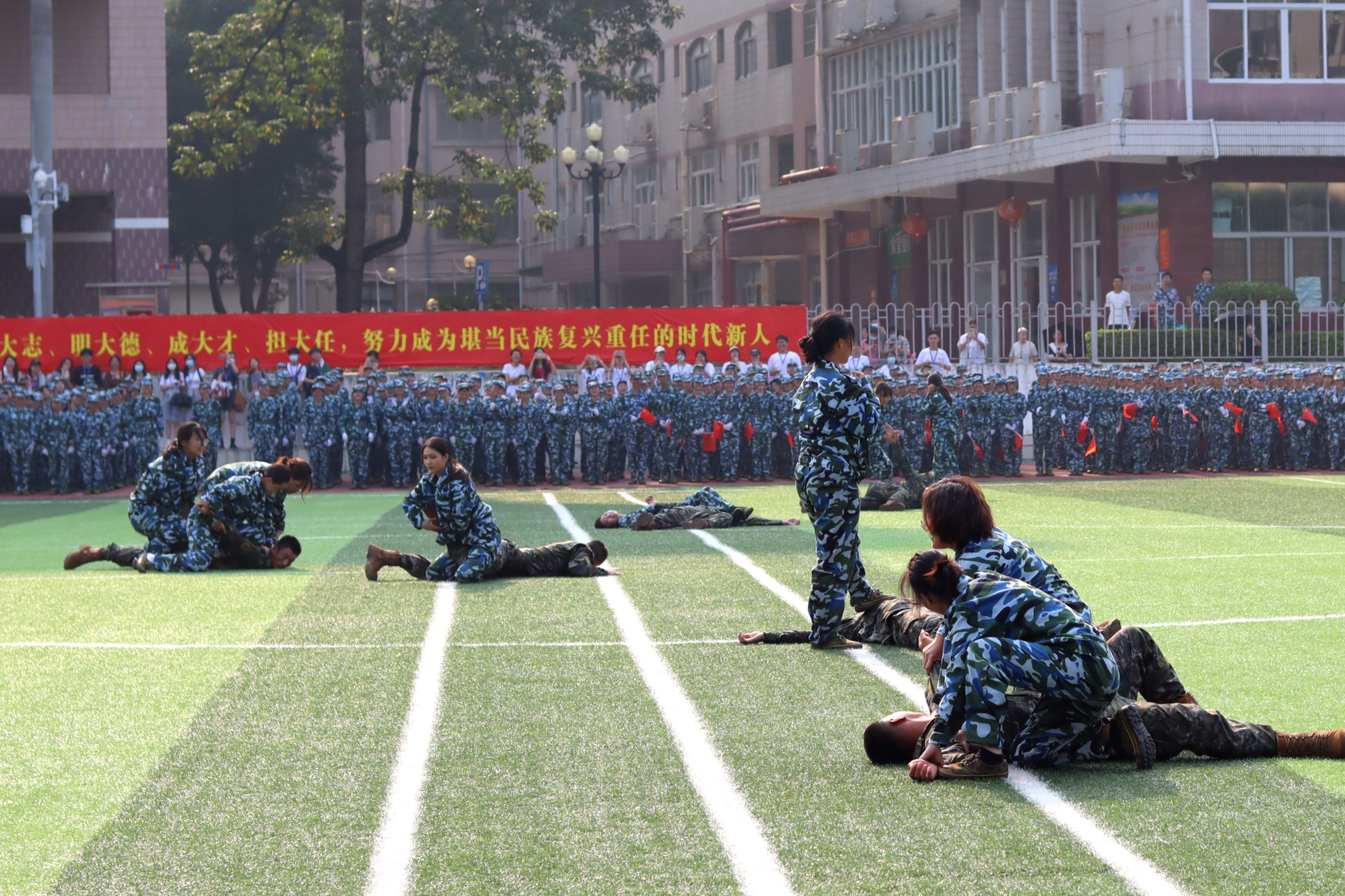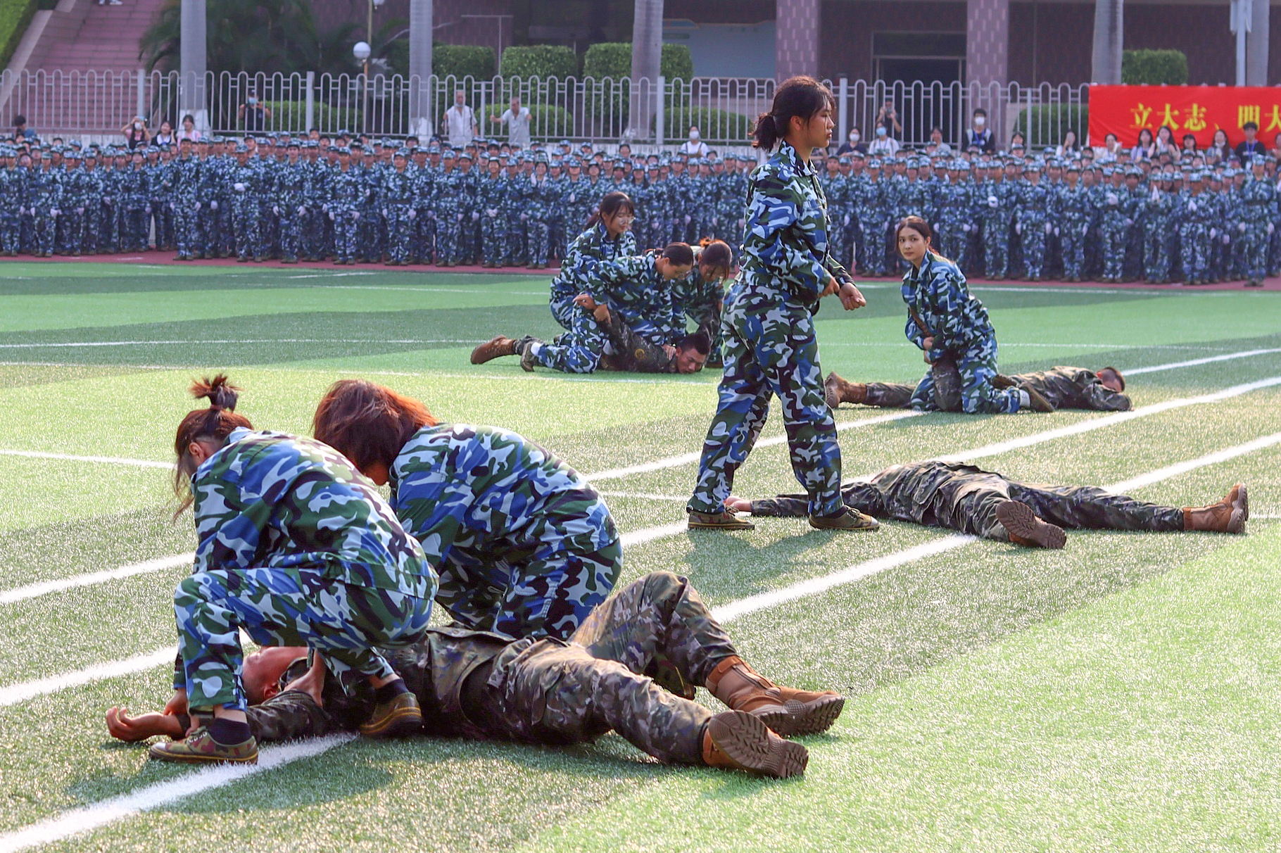 2022级军训汇报表演暨总结表彰大会正式开始,军训团四营营旗进入会场。随后,分列式方阵、军体拳方阵、女子防身术队伍、匕首操方阵等为全体参会人员带来精彩的军训表演。