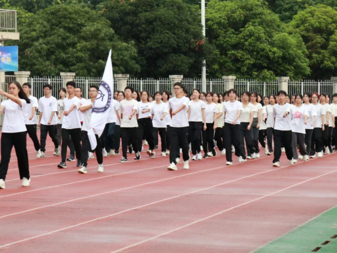 音乐声响,人文学子昂首挺胸,自信张扬,以整齐划一的步伐迈向主席台。“执笔生风,缀字成弓,人文学子,剑指长空。”铿锵有力的口号声响彻云霄,彰显着人文学子拼搏进取、自强自信的精神风貌。