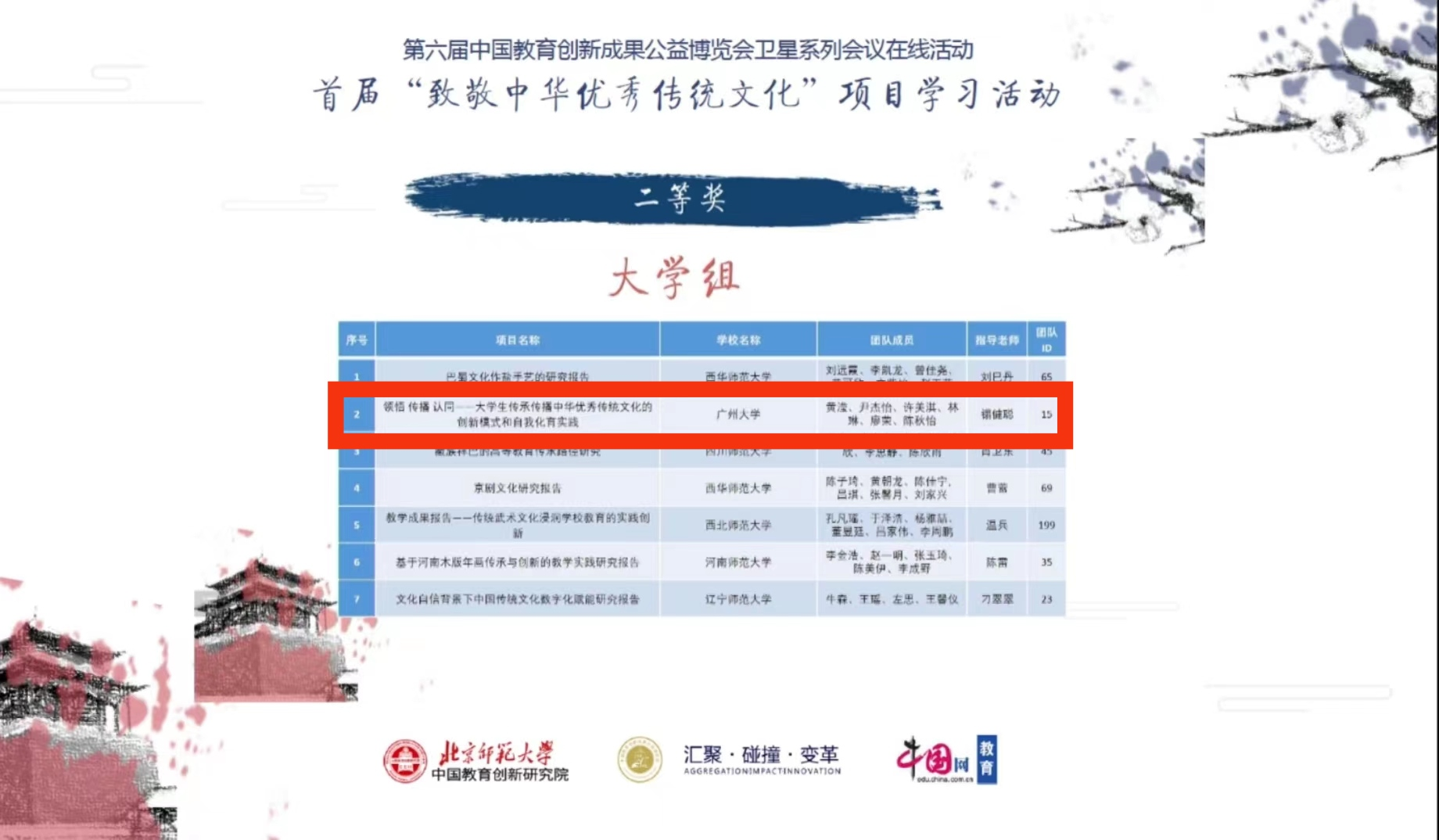由中国教育创新成果公益博览会组委会、中国网教育频道、北京师范大学中国教育创新研究院共同主办的第六届中国教育创新成果公益博览会之首届“致敬中华优秀传统文化”项目活动于近日落下帷幕。该活动面向全国举行,累计共有2000人次参与,经过近一年的选拔与评审,22支高校团队成功入围总决选,其中广东高校团队仅两支。
