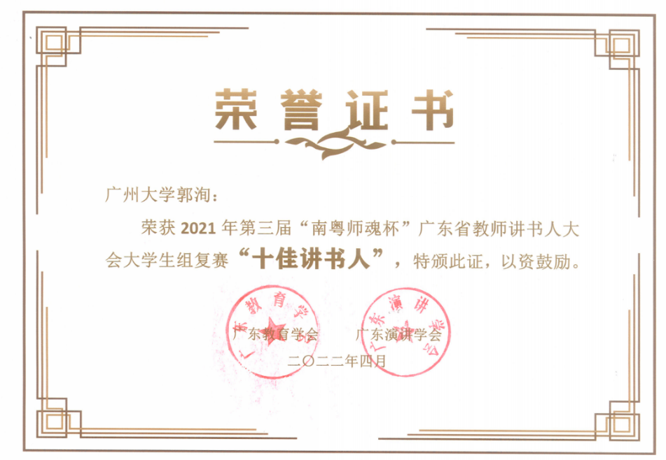 共有45名同学获奖,其中汉语196班师范生郭洵同学以优异表现进入了总决赛,并荣获决赛三等奖和“十佳讲书人”称号,再次获“优秀组织单位”表彰。