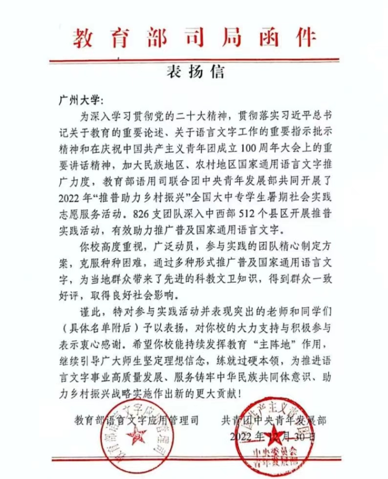 将继续深入学习贯彻党的二十大精神,贯彻落实习近平总书记关于教育的重要论述、关于语言文字工作的重要指示批示精神等,拓宽学生思政教育空间,搭建全方位育人平台,立足湾区、心系国家,为推进语言文字高质量发展、服务铸牢中华民族共同体意识、助力乡村振兴战略实施做出更大贡献!