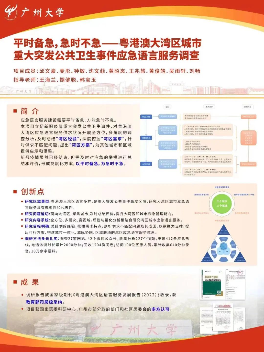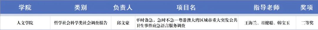 青春孕育无限希望,青年创造美好明天 五月榴花照眼明,枝间时见子初成 在这个充满活力的季节 广大学子相聚中山大学 共赴“挑战杯”盛宴 2023年5月28日下午 第十七届“挑战杯” 广东大学生课外学术科技作品竞赛 终审决赛 在中山大学南校区顺利落下帷幕 成人电影 参赛作品 哲学社会科学类社会调查报告 平时备急,急时不急 ——粤港澳大湾区 城市重大突发公共卫生事件 应急语言服务调查 荣获省赛二等奖 在院团委和各指导老师的带领下 经过严密遴选 一路过关斩将 来到中山大学 与全省156 所高校的项目团队一决高低 充分展现青年的智慧和风采 省赛期间 成人电影 校团委副书记李睿贤老师 成人电影 党委副书记张立老师 成人电影 团委书记韩宝玉老师 来到项目展位 为参赛团队师生加油鼓劲 青春不息 挑战不止 希望人文学子 能持之以恒 学习新思想、挑战新高度 展现广大青年的新担当、新力量