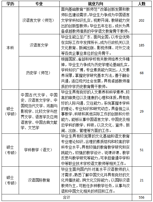 “德才兼备、家国情怀、视野开阔,爱体育、懂艺术,能力发展性强”人才培养目标,以“新文科”“新师范”建设引领,突出综合性、人文性和师范性,其中汉语言文专业为国家首批一流专业建设点、广东省重点专业和广东省人才培养模式创新实验区;历史学专业入选2020年度国家级一流本科专业建设点,为广东省综合改革试点专业。学院致力于培养具有坚定正确的政治方向,掌握系统扎实的汉语言文学基本理论和专业知识,具备良好的汉语运用能力和较强的专业研究能力,思想品德高尚,人文视野开阔,实践能力突出,善于会通开新的复合创新型卓越人才。毕业生能立足广东、放眼天下,以专业优势在实际工作中发挥所长,能够从事中国语言文学及相近学科的教学、科研,成为行政机关以及文化教育、新闻出版、影视传媒、对外交流等各类企事业单位的业务骨干。