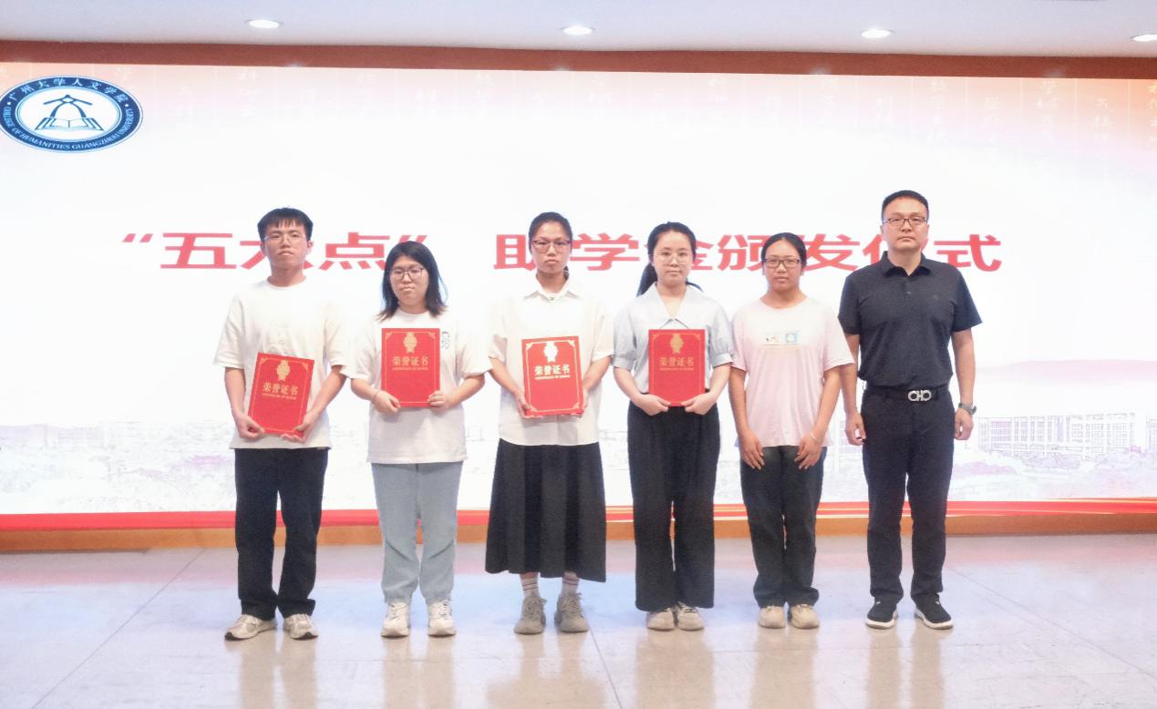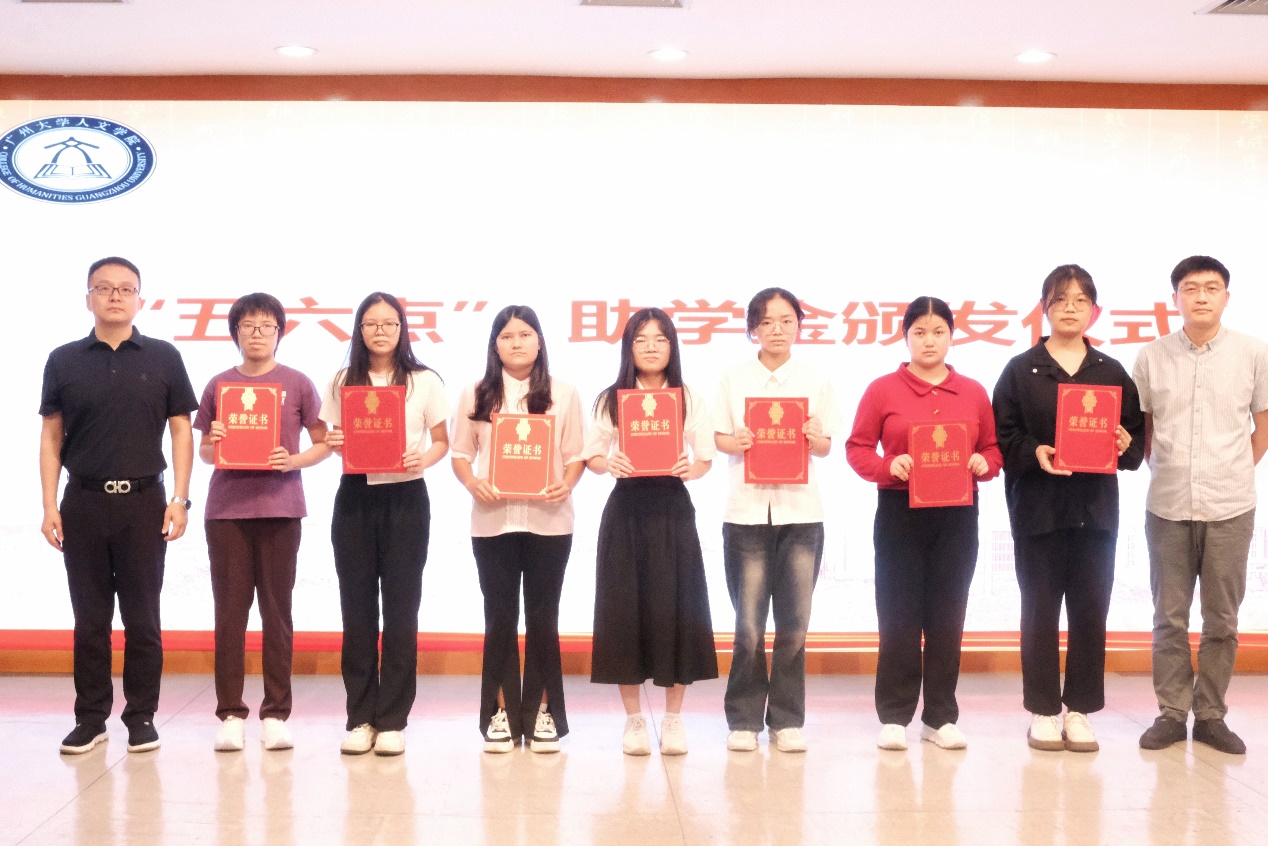 接下来卢捷部长、禤健聪院长、“五六点”教育董事长王浩兵、合伙人胡国炜分别为受助学生代表颁发证书。