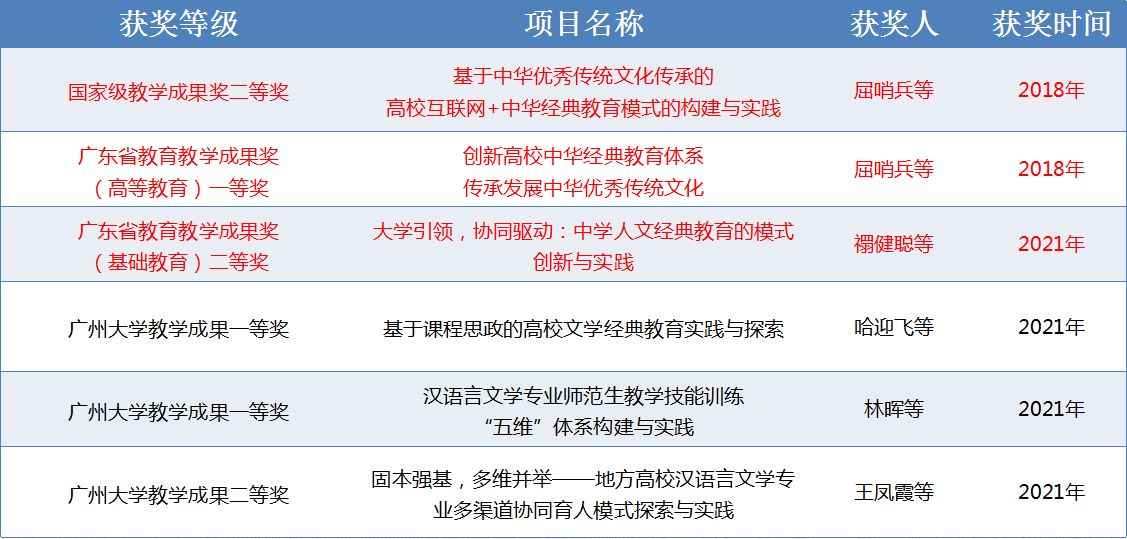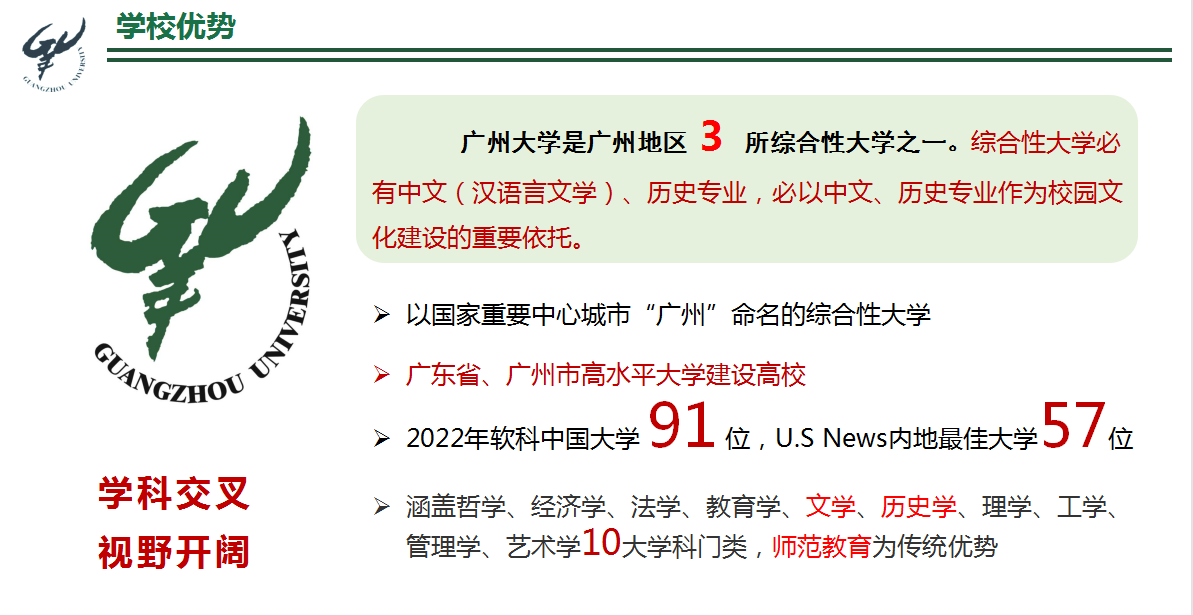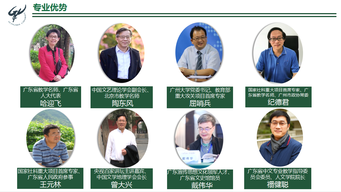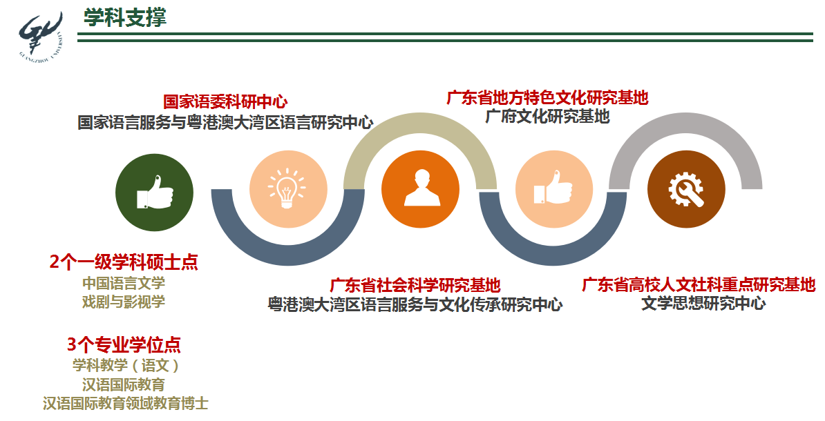 汉语言文学专业所在的中国语言文学学科是广东省一级重点学科,汉语言文学专业有2个一级学科硕士点:中国语言文学、戏剧与影视学,3个专业学位点:学科教学(语文)、汉语国际教育、汉语国际教育领域教育博士;历史学专业也对接有中国史一级学科学位点。另外,学院还有4个国家级、省级科研平台,为本科专业提供了重要的学科支撑。