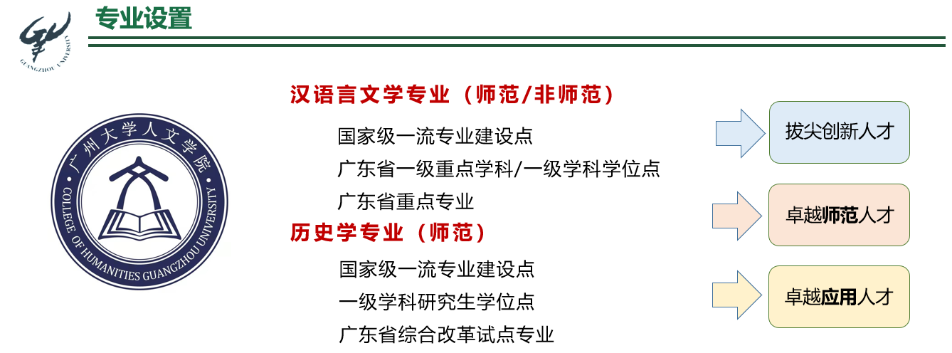 广东省内,同时兼有汉语言文学一流专业建设点和一级重点学科的,只有四所高校;同时兼有历史学一流专业建设点和一级学科学位点的,全省也只有四所高校。其中,同时招师范方向学生的,则只有两所高校。由此可见,学院的专业排在全省前列。