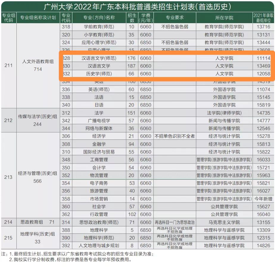 广东省内首选科目为历史考生均可报考,汉语言文学(师范)、汉语言文学、历史学(师范)专业组代码均为211,均在人文外语教育组,汉语言文学(师范)专业代码为328,汉语言文学专业代码为330,历史学(师范)专业代码为332。