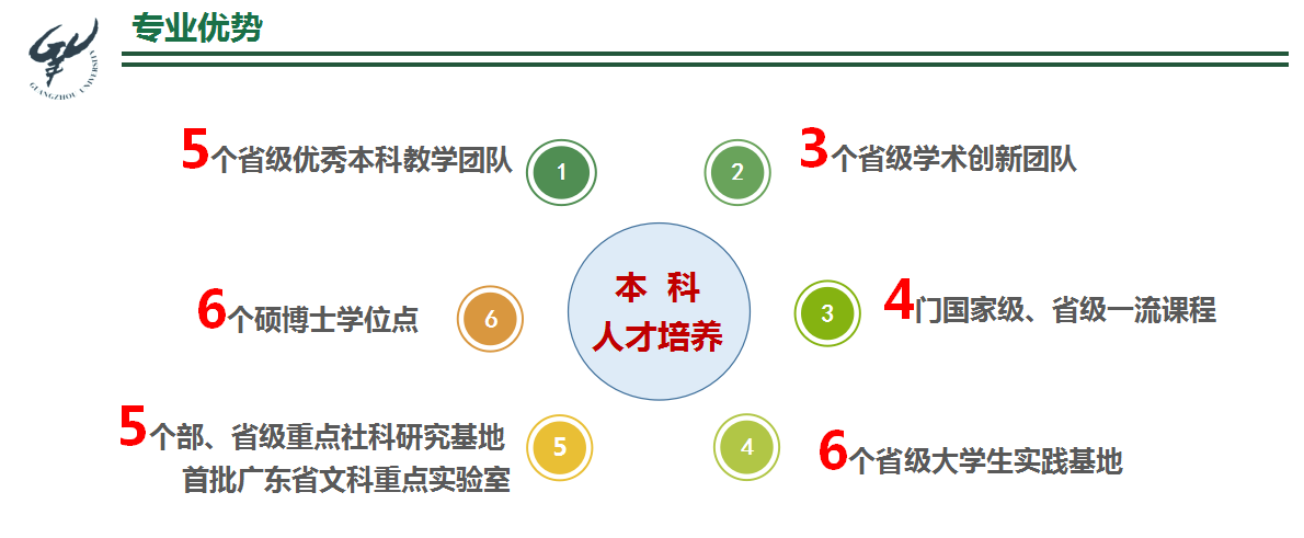 学院对本科教学的投入度极大。学院拥有5个省级优秀本科教学团队,3个省级学术创新团队,6个硕博士学位点,4门国家级、省级一流课程,5个部、省级重点社科研究基地,首批广东省文科重点实验室,6个省级大学生实践基地。学院的本科平台,在全省人文类专业中,首屈一指,从全省全部学科专业来看,也是屈指可数。