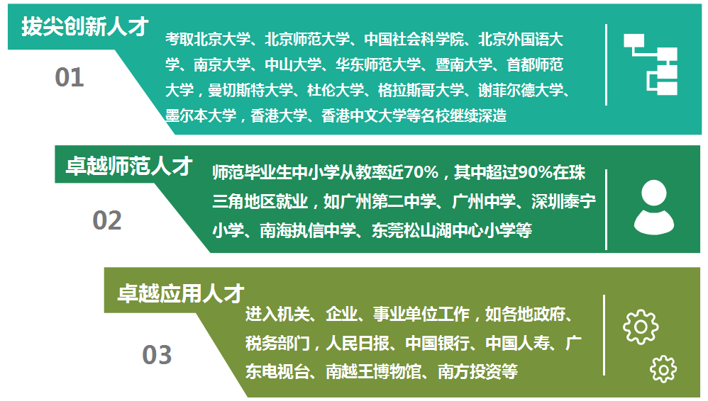 学院的毕业生到北京大学、北京师范大学、中国社会科学院、曼彻斯特大学、香港大学等名校深造,成为拔尖创新人才;师范毕业生近70%从事中小学语文、历史教育,其中90%在珠三角就业,成为卓越师范人才;还有相当部分毕业生到机关企事业单位工作,成为卓越应用人才。