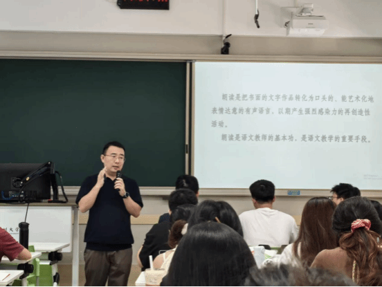 本次公开课的主题是“语文课堂教学朗读技能训练”,丁老师从都德《最后一课》这篇课文不同朗读录音的比较引入,提出“两段朗读给你的感受有何不同?朗读者对文字做了什么?”等问题,分析其中的感情色彩处理、角色代入和潜在教学引导等具体技能问题,教学围绕着教学技能的实操训练展开。丁老师继而阐发了“语文教学中的朗读不是简单地出声,而是包涵了“再创、形象、规范”三重基本要求的重要知识点。同时,引入停连、语速、重音、语调等四个语音技巧概念,训练学生通过语音实现“勾勒情感的跌宕”“点亮词眼与诗心”“驾驭文气的舒徐”“描摹心路的起伏”等教学技能的掌握。