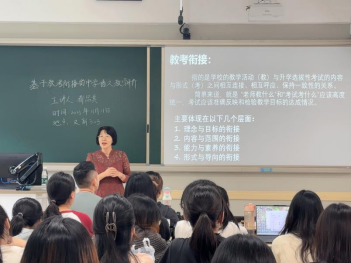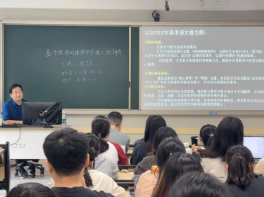 讲座伊始,都老师直指当前中学语文教学中“教”与“考”脱节的现实困境,回顾了过往中高考命题与教材关联度不高,导致部分备考陷入“弃教材、研考题”的窘境,深刻剖析教考衔接对整体语文教学的重要性——主要体现在理念与目标、内容与范围、能力与素养、形式与导向四个层面的衔接。以2025年高考语文卷题目为例,都老师分析并强调教学必须引导学生思考本末关系,提升学生的思辨能力。