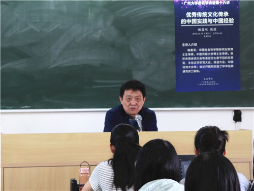 关于“中国实践”,姚教授分析了古今传播文化的途径,如古代的口耳相传,现代的传媒技术等,这些途径都为中华优秀传统文化的传承扮演了重要的角色。“语言是打开一国文明的钥匙”,姚教授说道,“我们应发挥语言的连接功能、基础功能,以发挥语言对传播文化的关键作用。”期间,姚教授以正在实施在“中华诵读写工程”例子,阐述了“精选朗诵者”、“书法进课堂”、“专家讲解”对传承优秀传统文化的作用。