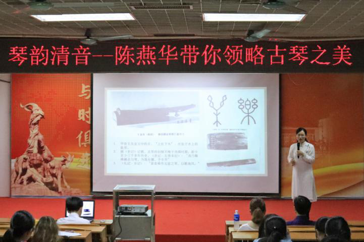 陈燕华老师强调了古琴的礼乐内涵,指出古琴文化艺术与中国传统文化的紧密联系,以及古琴的中国式审美观点与哲学思想。紧接着,陈燕华老师向同学们分析了古琴发展的喜与忧。值得欣喜的是,古琴艺术已走向世界,并于2003年被列入世界非遗名单。但古琴的继承与发展速度仍较缓慢,目前学习古琴的人数仍然较少,陈老师殷切希望在场的同学们能逐渐培养对古琴的兴趣并尝试学习弹奏。