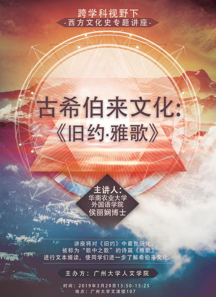 跨学科视野下西方文化史专题讲座“古希伯来文化:《旧约·雅歌》”在文清107顺利举行。本次讲座由戏剧与影视学系的张颖老师主持,邀请到华南农业大学外国语学院的侯丽娴博士担任主讲人。讲座旨在对《旧约》中最世俗化、被称为“歌中之歌”的诗篇《雅歌》进行文本细读,使同学们进一步了解希伯来文化。