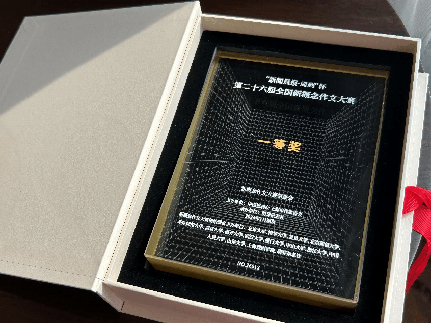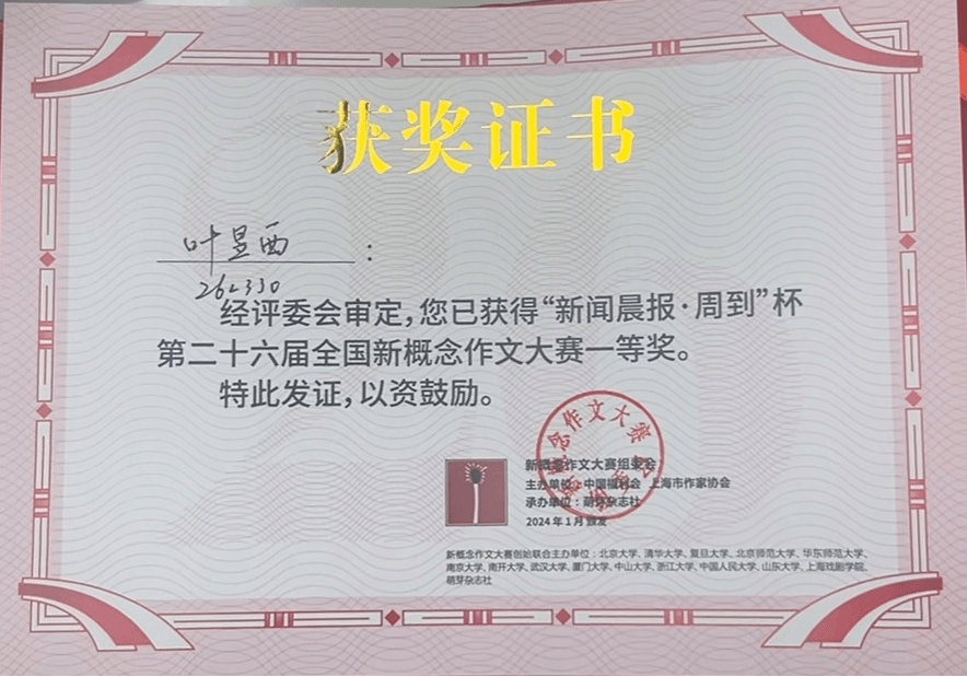 汉语言文学222班叶昱西同学进入复赛,并在复赛的现场作文中脱颖而出,荣获第二十六届全国新概念作文大赛一等奖。