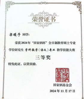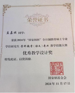 11月15日至17日,2024年“田家炳杯”全日制教育硕士专业学位研究生学科教学(语文)专业教学技能大赛决赛在江苏师范大学举行,成人电影 2023级学科教学(语文)专业硕士研究生梁曦予、孟嘉琪分别荣获大赛三等奖和优秀教学设计奖,指导教师为李丽华副教授。