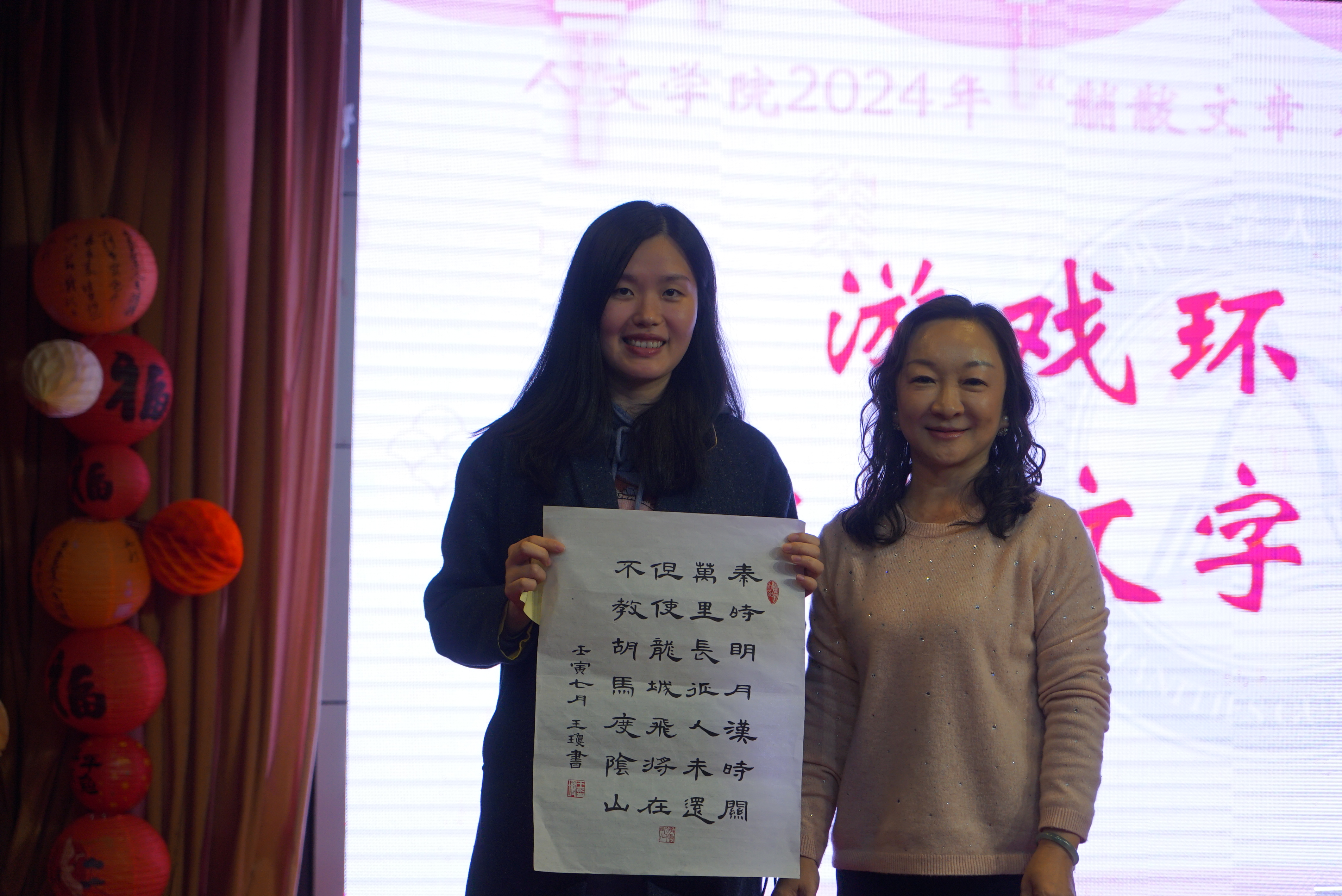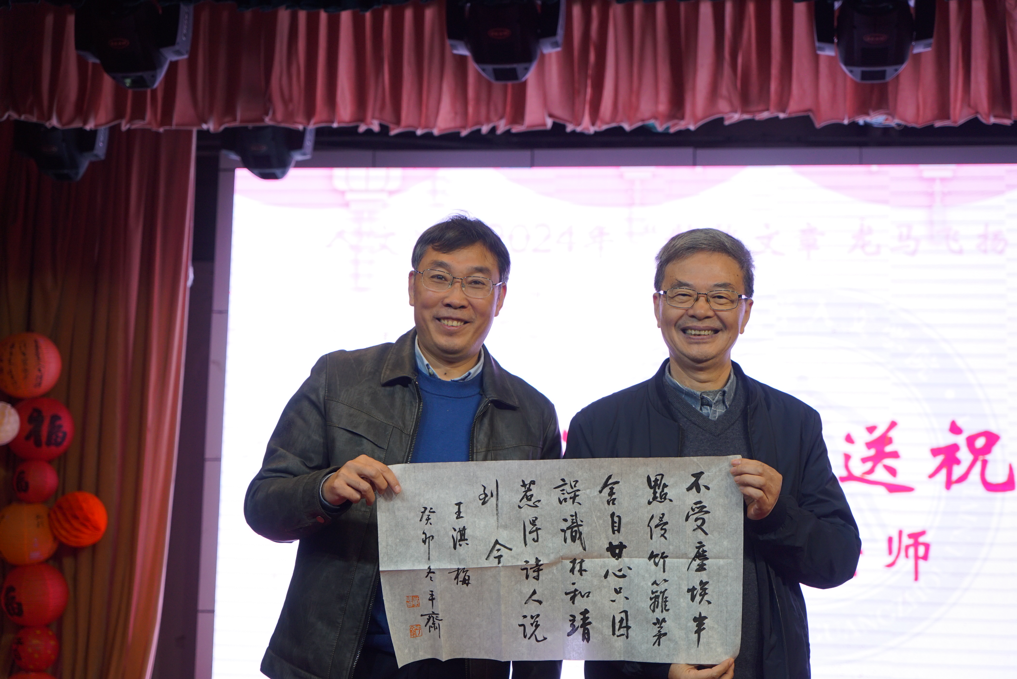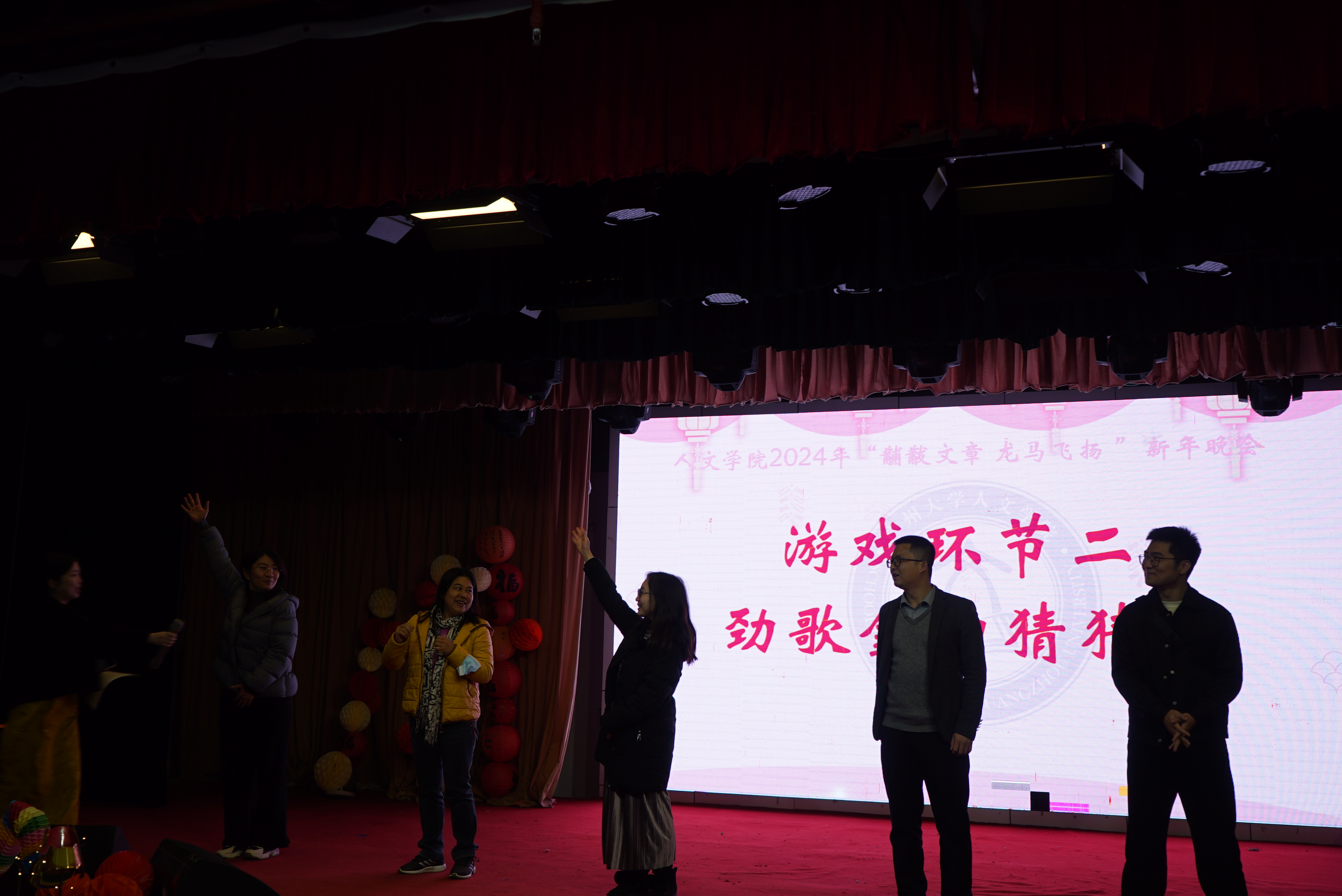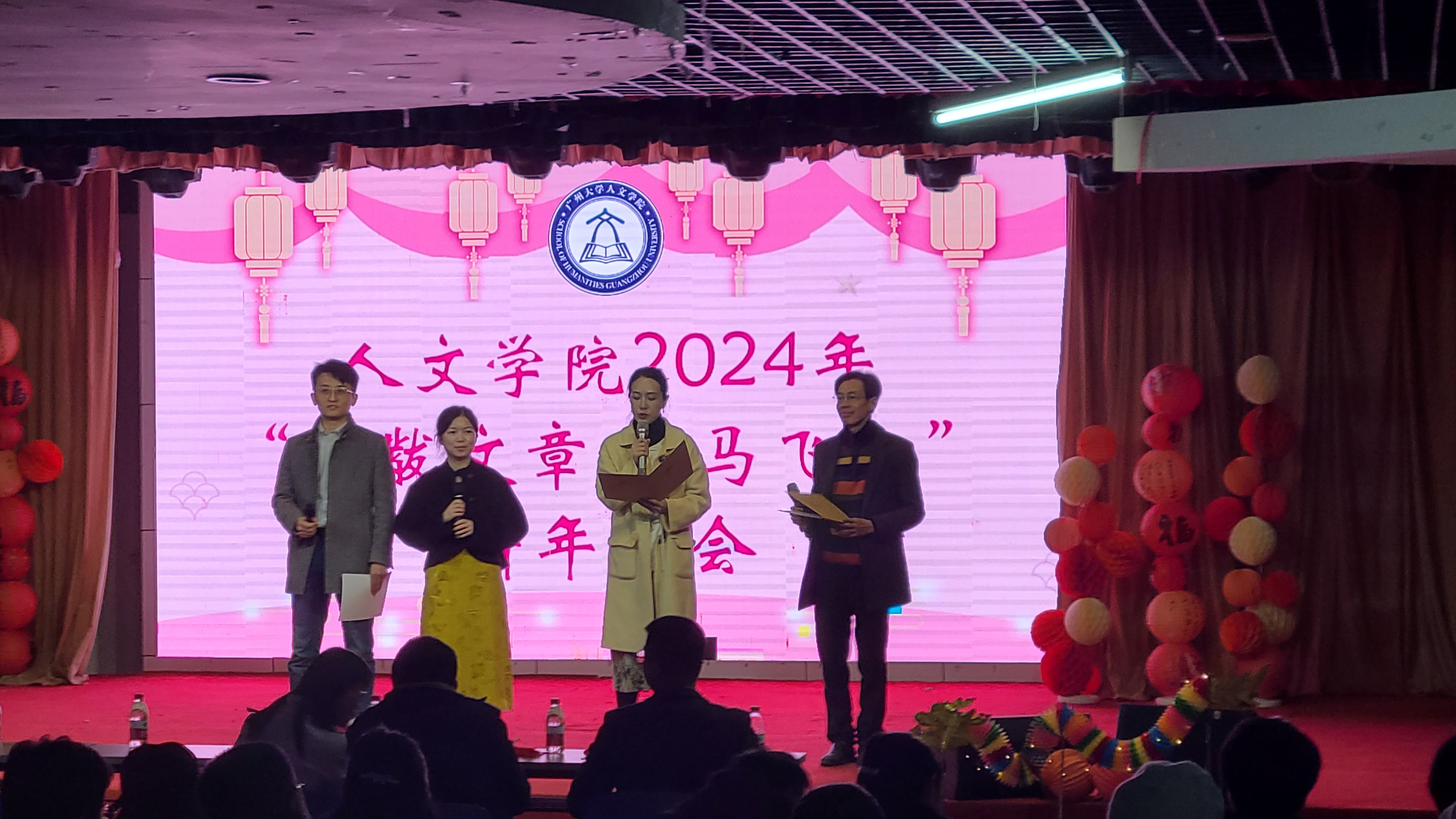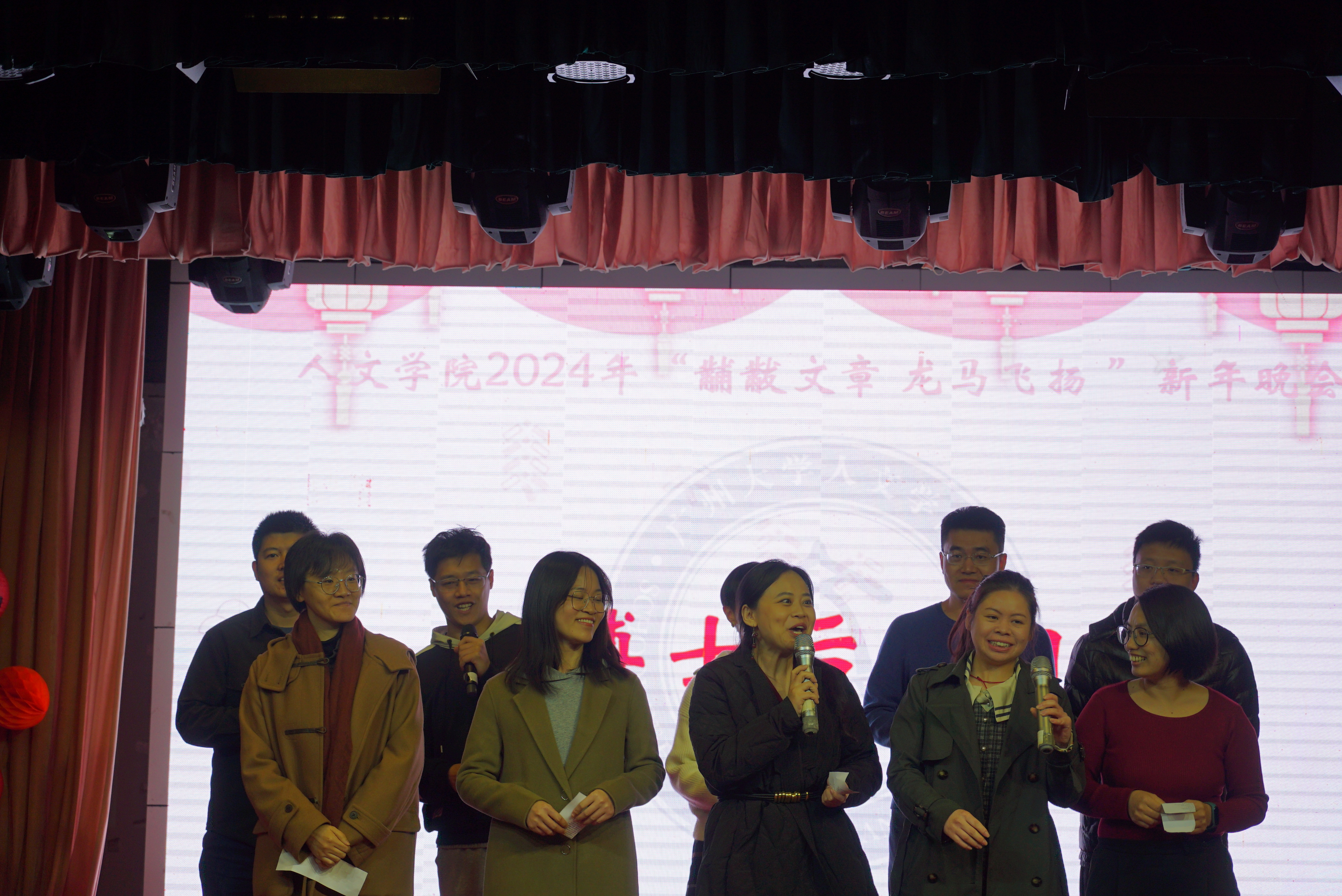 院长禤健聪、党委书记王琼、副院长李茂增、马喆、王元林、党委副书记张立、胡鉴源等学院各位领导老师参与了本次活动,晚会由邓海涛、刘静雯、韦施伊、侯本塔四位老师主持。晚会以“黼黻文章,龙马飞扬”为主题,寄予人文新年新气象、新风采。