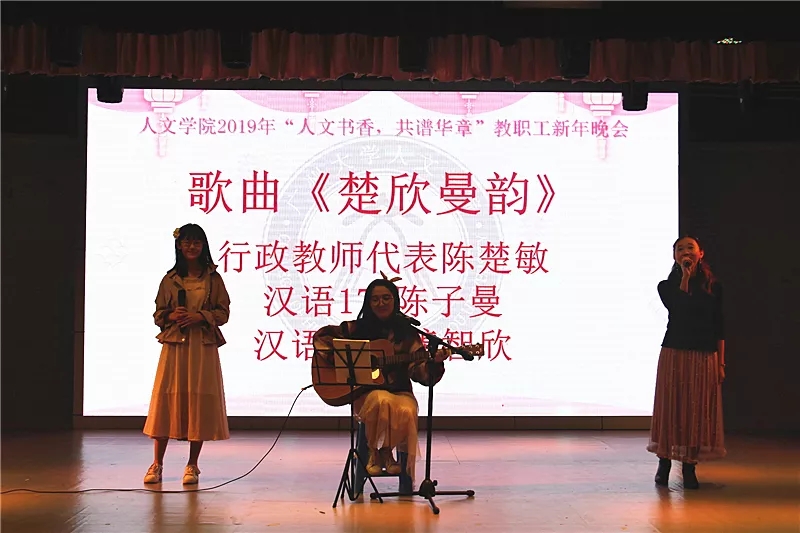 行政教工代表陈楚敏老师,联袂“满天星”组合(汉语174陈子曼、汉语172龚智欣)带来了《楚欣曼韵》吉他弹唱串烧,把简单的《小情歌》,混搭上了《答案》、《千千阙歌》、《身骑白马》、《喜欢你》、《我只在乎你》、《红日》等流行曲,最后的民谣版校歌更是让人耳目一新,热情澎湃。