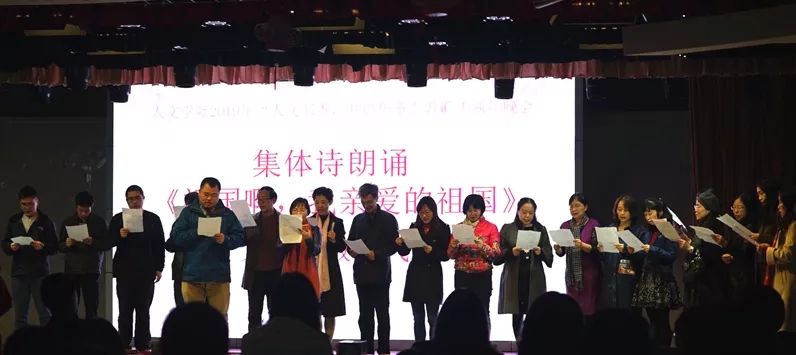 文学系教师代表在李俏梅与江曙两位老师领诵下,集体朗诵了舒婷经典诗作《祖国啊,我亲爱的祖国》,表达了对祖国深沉而热烈的爱。