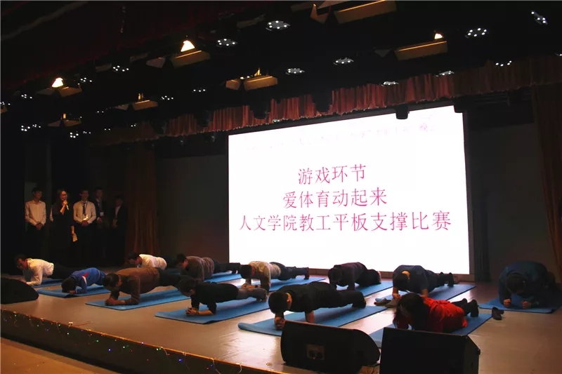 教职工除了积极践行“懂艺术”育人理念之外,在“爱体育”方面也是能人辈出,纪院长与王书记带头参与平板支撑游戏互动小竞赛,数名教职工积极响应,上台参与,在劲歌《卡路里》中、此起彼伏的现场欢呼声与加油声中全场集体燃烧卡路里,使晚会进入再一个高潮!