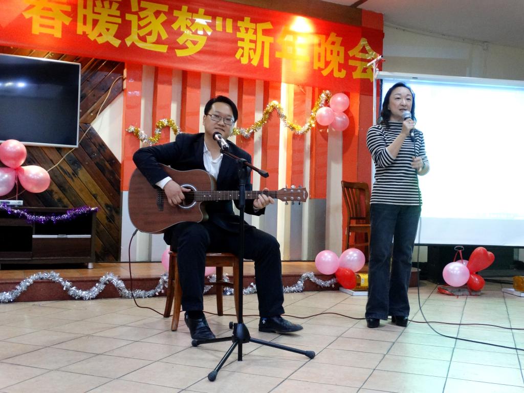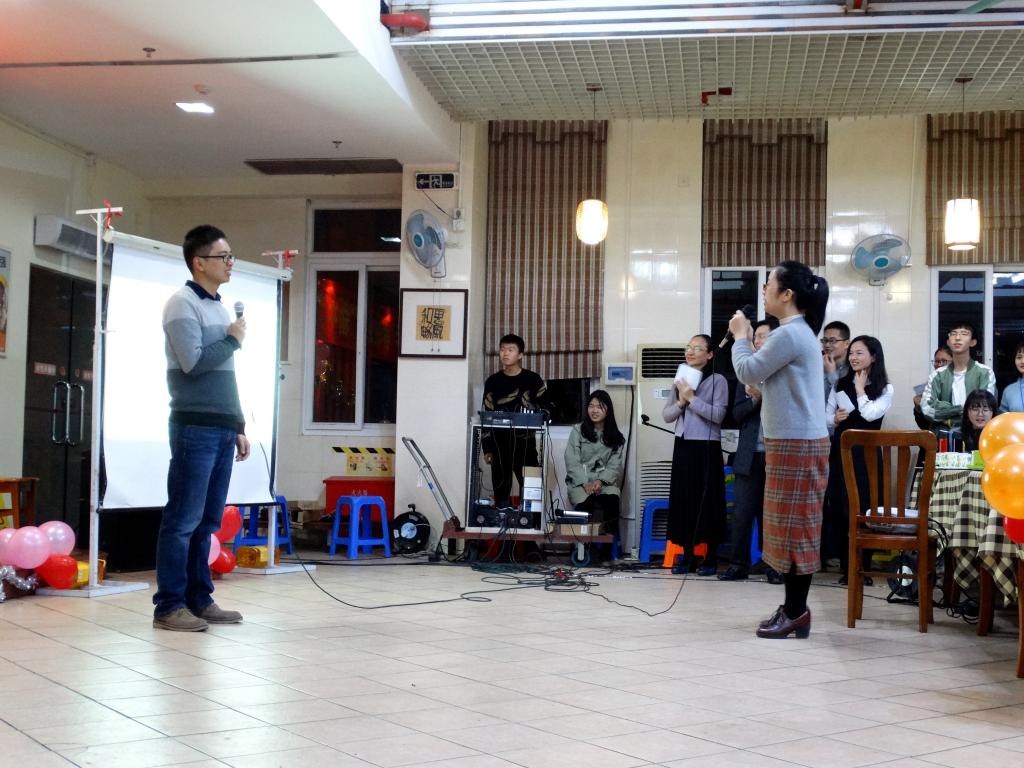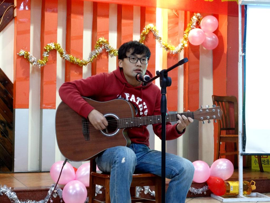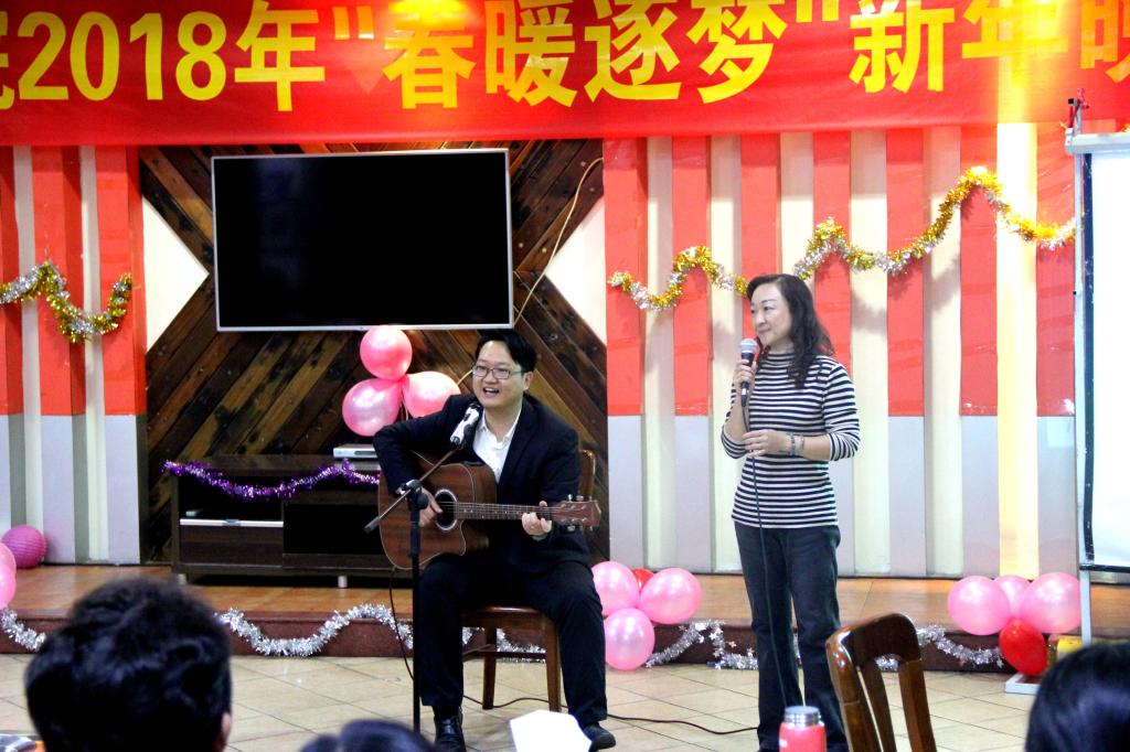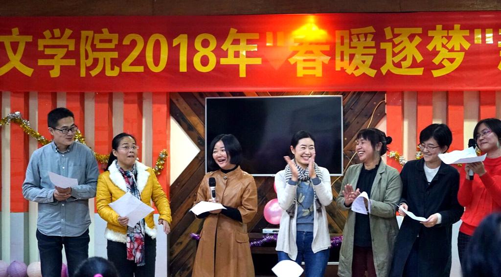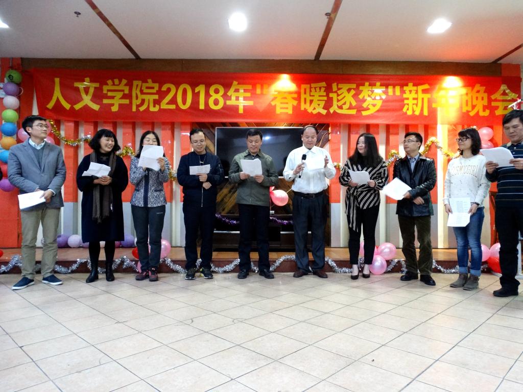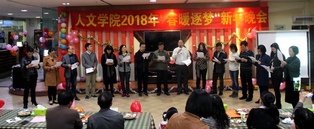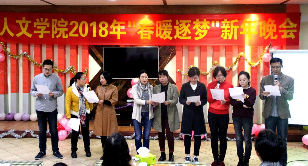 纪德君院长一首《光阴的故事》,带领我们回首过去学院经历的不平凡一年;冉东平教授的《鸿雁》和吴晟教授的《心雨》即兴演唱表达了他们深厚的感情;秘书系邓海涛老师演唱了充满岭南特色的粤曲《云端庆升平》;王琼书记与历史系王睿老师的吉他弹唱《月亮代表我的心》;还有邵薇、王苗、江曙老师分别用韩语、法语、英语动情演唱;戏剧与影视学系教师们用美妙的歌声,让我们领略了一番《万水千山总是情》,众多动人的人文心声让人陶醉不已。